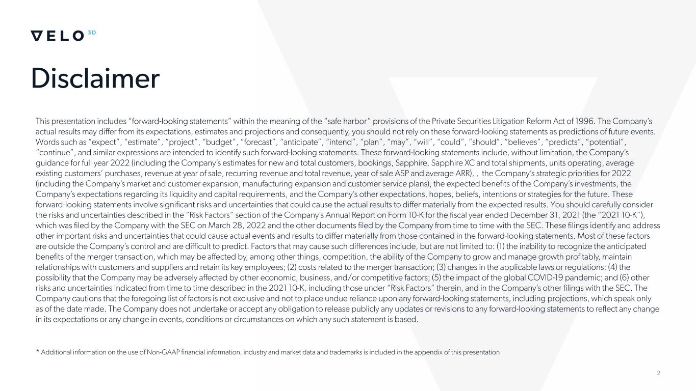 2 Disclaimer * Additional information on the use of Non-GAAP financial information, industry and market data and trademarks is included in the appendix of this presentation This presentation includes “forward-looking statements” within the meaning of the “safe harbor” provisions of the Private Securities Litigation Reform Act of 1996. The Company’s actual results may differ from its expectations, estimates and projections and consequently, you should not rely on these forward-looking statements as predictions of future events. Words such as “expect”, “estimate”, “project”, “budget”, “forecast”, “anticipate”, “intend”, “plan”, “may”, “will”, “could”, “should”, “believes”, “predicts”, “potential”, “continue”, and similar expressions are intended to identify such forward-looking statements. These forward-looking statements include, without limitation, the Company’s guidance for full year 2022 (including the Company’s estimates for new and total customers, bookings, Sapphire, Sapphire XC and total shipments, units operating, average existing customers’ purchases, revenue at year of sale, recurring revenue and total revenue, year of sale ASP and average ARR), , the Company’s strategic priorities for 2022 (including the Company’s market and customer expansion, manufacturing expansion and customer service plans), the expected benefits of the Company’s investments, the Company’s expectations regarding its liquidity and capital requirements, and the Company’s other expectations, hopes, beliefs, intentions or strategies for the future. These forward-looking statements involve significant risks and uncertainties that could cause the actual results to differ materially from the expected results. You should carefully consider the risks and uncertainties described in the “Risk Factors” section of the Company’s Annual Report on Form 10-K for the fiscal year ended December 31, 2021 (the “2021 10-K”), which was filed by the Company with the SEC on March 28, 2022 and the other documents filed by the Company from time to time with the SEC. These filings identify and address other important risks and uncertainties that could cause actual events and results to differ materially from those contained in the forward-looking statements. Most of these factors are outside the Company’s control and are difficult to predict. Factors that may cause such differences include, but are not limited to: (1) the inability to recognize the anticipated benefits of the merger transaction, which may be affected by, among other things, competition, the ability of the Company to grow and manage growth profitably, maintain relationships with customers and suppliers and retain its key employees; (2) costs related to the merger transaction; (3) changes in the applicable laws or regulations; (4) the possibility that the Company may be adversely affected by other economic, business, and/or competitive factors; (5) the impact of the global COVID-19 pandemic; and (6) other risks and uncertainties indicated from time to time described in the 2021 10-K, including those under “Risk Factors” therein, and in the Company’s other filings with the SEC. The Company cautions that the foregoing list of factors is not exclusive and not to place undue reliance upon any forward-looking statements, including projections, which speak only as of the date made. The Company does not undertake or accept any obligation to release publicly any updates or revisions to any forward-looking statements to reflect any change in its expectations or any change in events, conditions or circumstances on which any such statement is based.