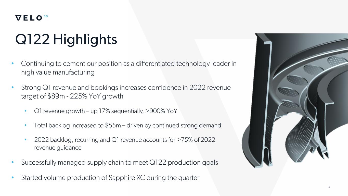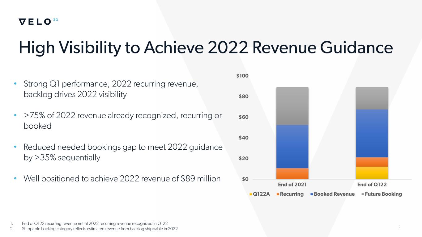 4 Q122 Highlights • Continuing to cement our position as a differentiated technology leader in high value manufacturing • Strong Q1 revenue and bookings increases confidence in 2022 revenue target of $89m - 225% YoY growth • Q1 revenue growth – up 17% sequentially, >900% YoY • Total backlog increased to $55m – driven by continued strong demand • 2022 backlog, recurring and Q1 revenue accounts for >75% of 2022 revenue guidance • Successfully managed supply chain to meet Q122 production goals • Started volume production of Sapphire XC during the quarter
