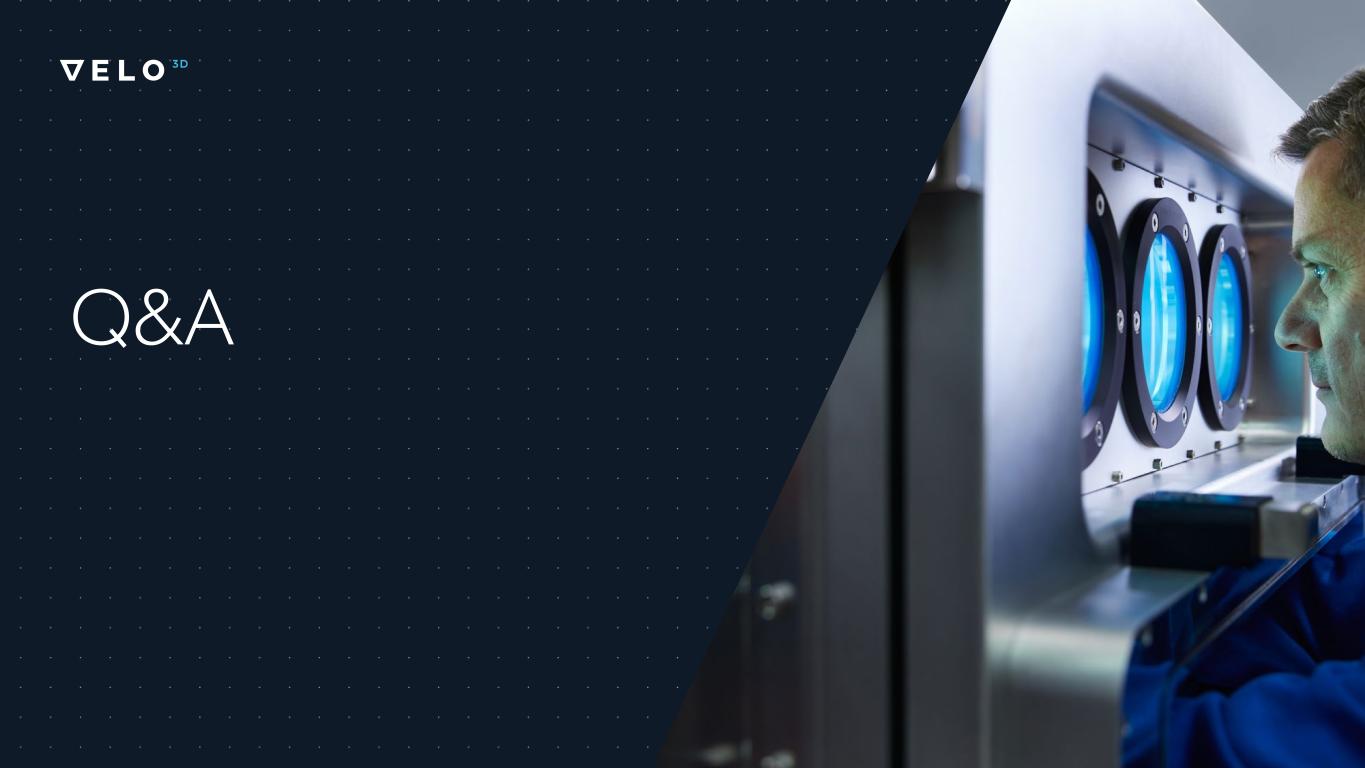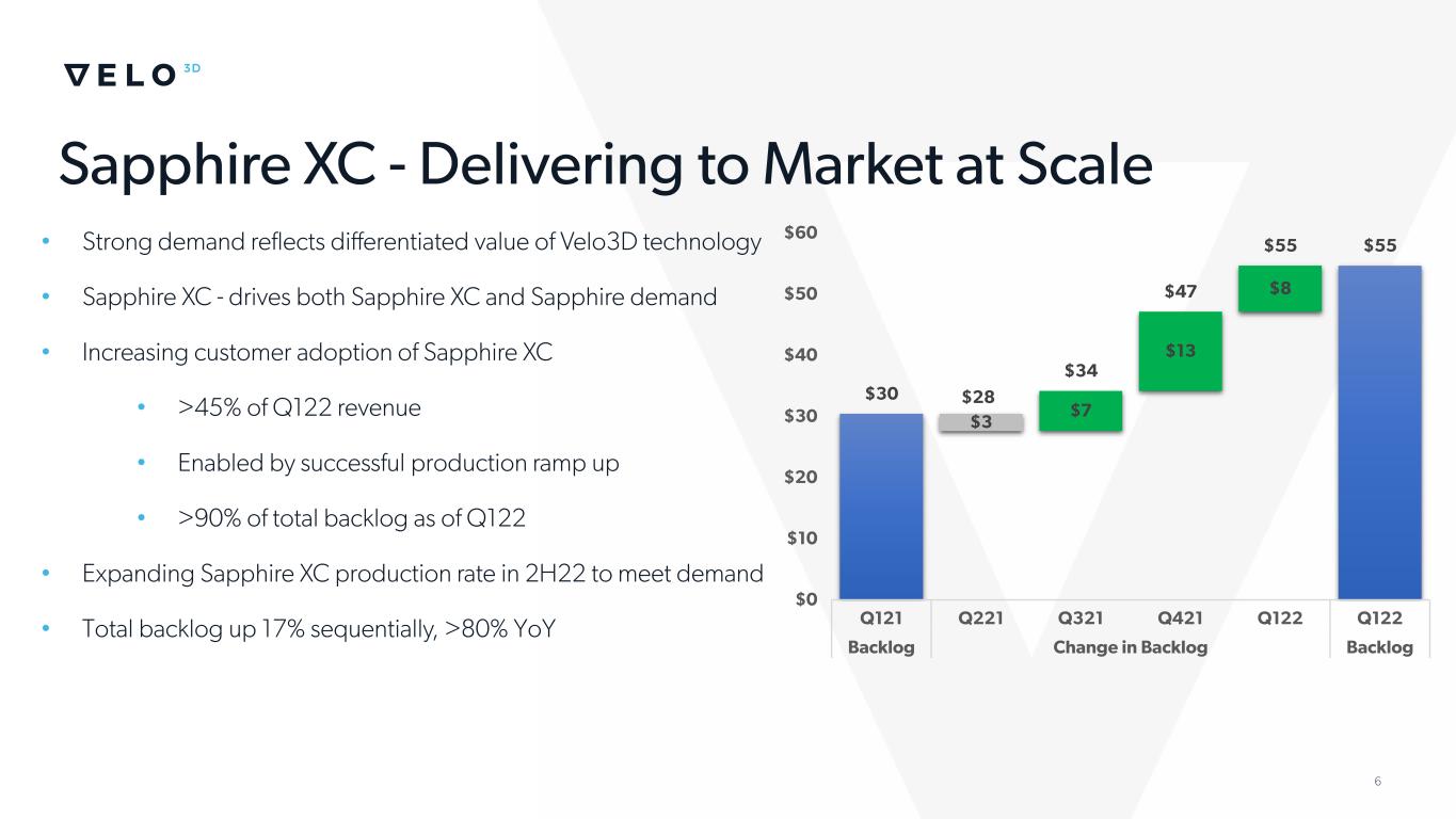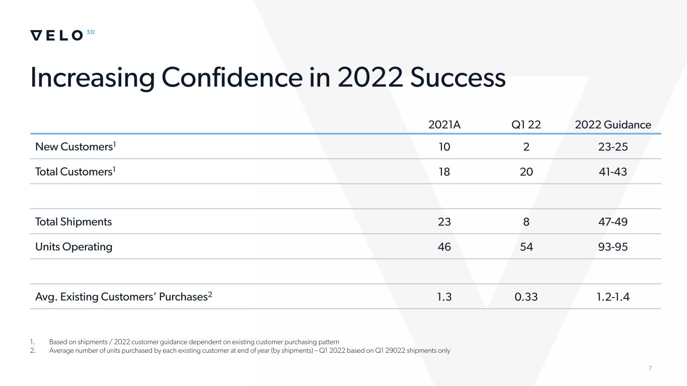 6 • Strong demand reflects differentiated value of Velo3D technology • Sapphire XC - drives both Sapphire XC and Sapphire demand • Increasing customer adoption of Sapphire XC • >45% of Q122 revenue • Enabled by successful production ramp up • >90% of total backlog as of Q122 • Expanding Sapphire XC production rate in 2H22 to meet demand • Total backlog up 17% sequentially, >80% YoY Sapphire XC - Delivering to Market at Scale $3 $7 $13 $8 $30 $28 $34 $47 $55 $55 $0 $10 $20 $30 $40 $50 $60 Q121 Q221 Q321 Q421 Q122 Q122 Backlog Change in Backlog Backlog