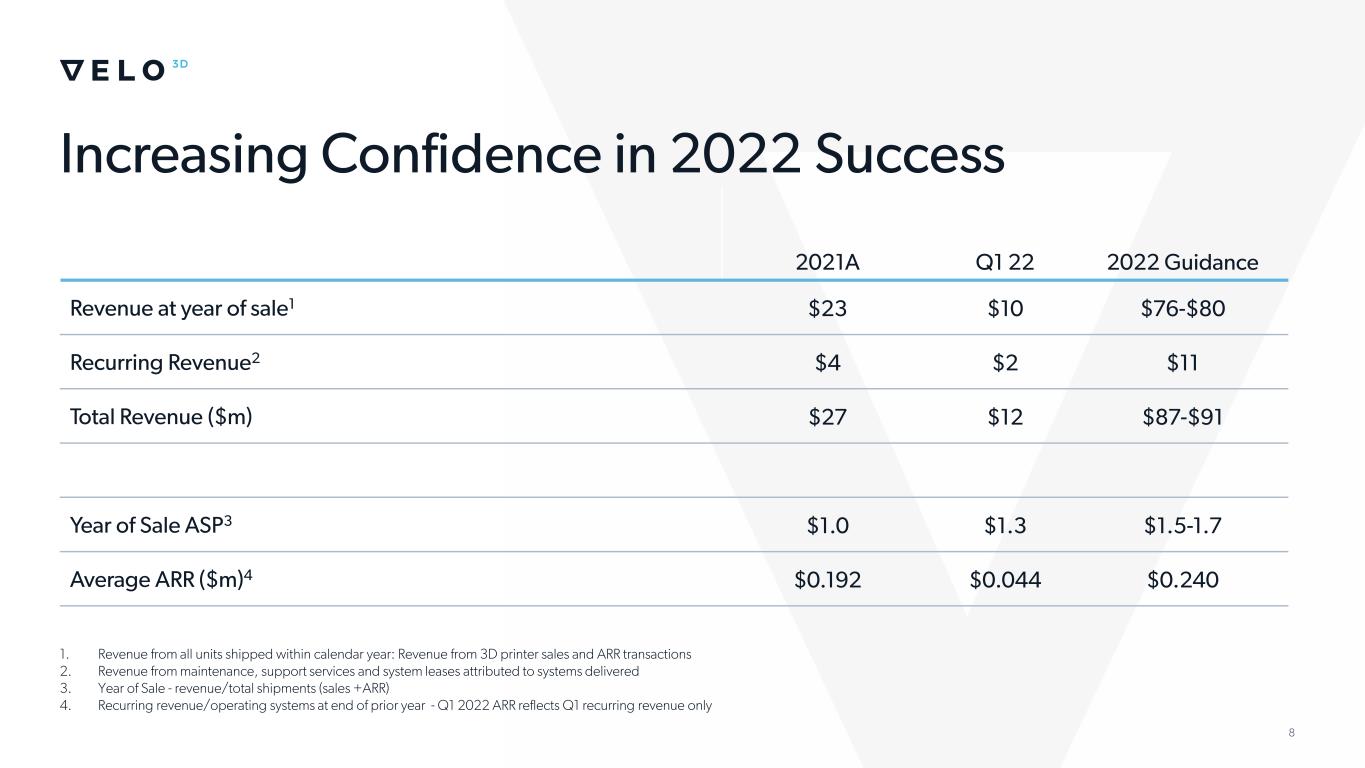 7 2021A Q1 22 2022 Guidance New Customers1 10 2 23-25 Total Customers1 18 20 41-43 Total Shipments 23 8 47-49 Units Operating 46 54 93-95 Avg. Existing Customers’ Purchases2 1.3 0.33 1.2-1.4 1. Based on shipments / 2022 customer guidance dependent on existing customer purchasing pattern 2. Average number of units purchased by each existing customer at end of year (by shipments) – Q1 2022 based on Q1 29022 shipments only Increasing Confidence in 2022 Success