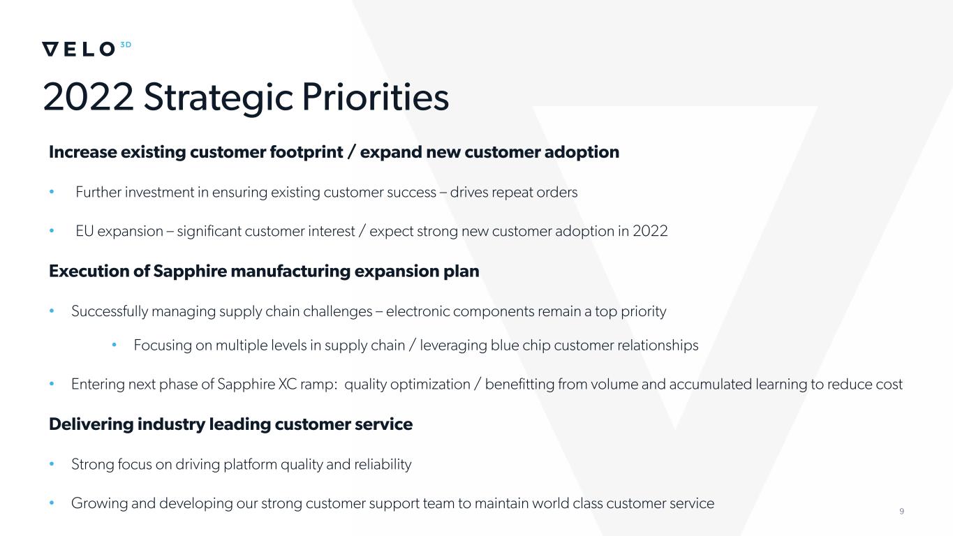 9 Increase existing customer footprint / expand new customer adoption • Further investment in ensuring existing customer success – drives repeat orders • EU expansion – significant customer interest / expect strong new customer adoption in 2022 Execution of Sapphire manufacturing expansion plan • Successfully managing supply chain challenges – electronic components remain a top priority • Focusing on multiple levels in supply chain / leveraging blue chip customer relationships • Entering next phase of Sapphire XC ramp: quality optimization / benefitting from volume and accumulated learning to reduce cost Delivering industry leading customer service • Strong focus on driving platform quality and reliability • Growing and developing our strong customer support team to maintain world class customer service 2022 Strategic Priorities