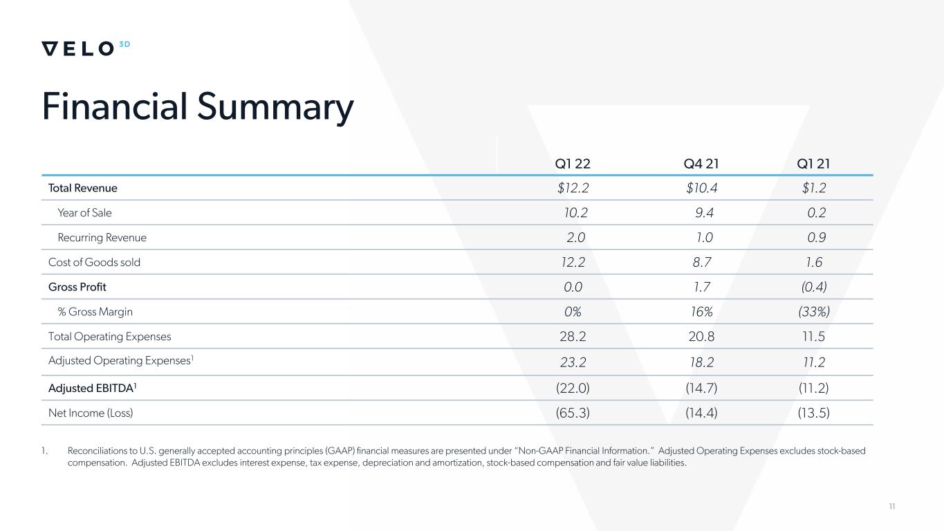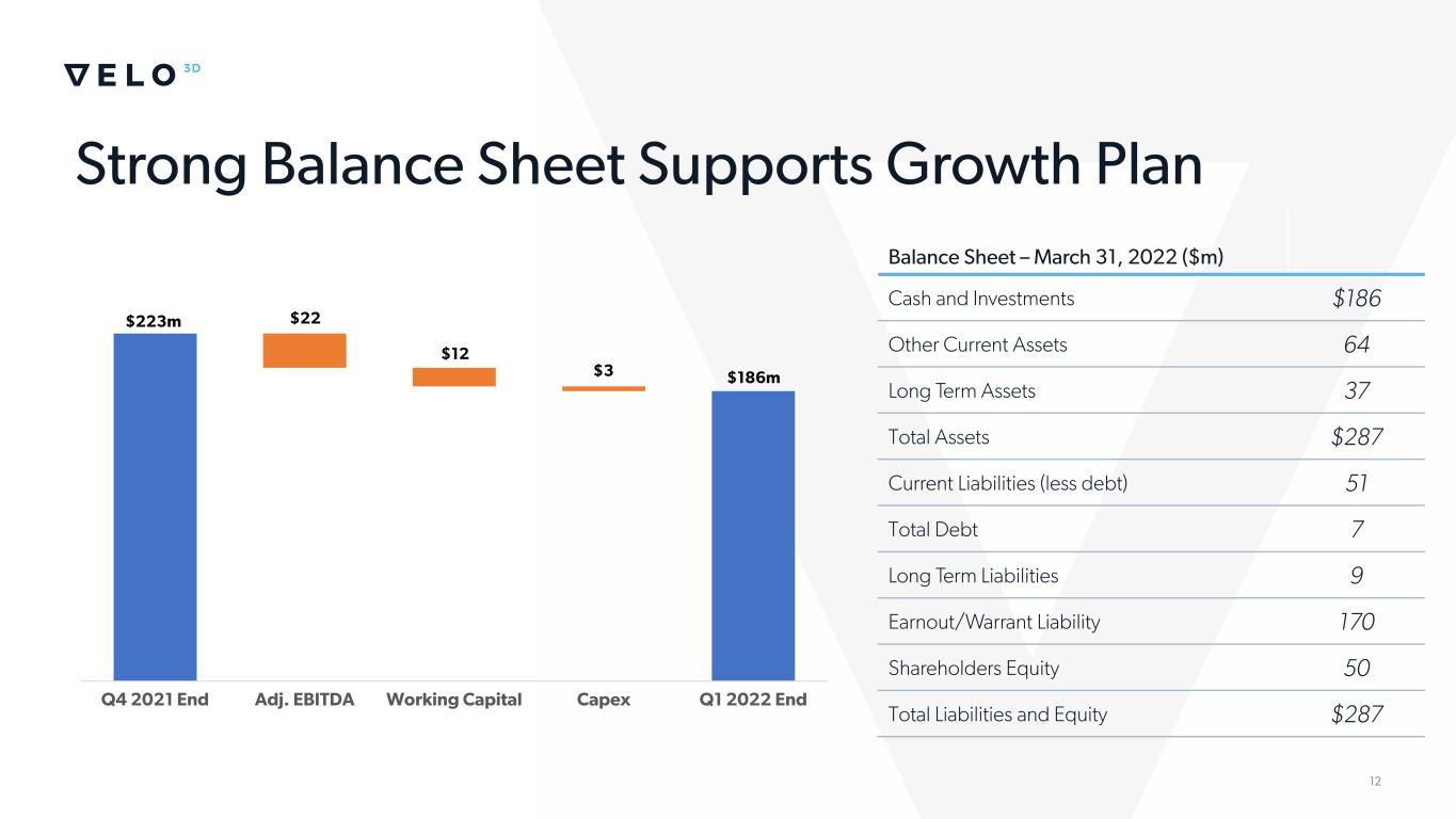11 Financial Summary 1. Reconciliations to U.S. generally accepted accounting principles (GAAP) financial measures are presented under “Non-GAAP Financial Information.” Adjusted Operating Expenses excludes stock-based compensation. Adjusted EBITDA excludes interest expense, tax expense, depreciation and amortization, stock-based compensation and fair value liabilities. Q1 22 Q4 21 Q1 21 Total Revenue $12.2 $10.4 $1.2 Year of Sale 10.2 9.4 0.2 Recurring Revenue 2.0 1.0 0.9 Cost of Goods sold 12.2 8.7 1.6 Gross Profit 0.0 1.7 (0.4) % Gross Margin 0% 16% (33%) Total Operating Expenses 28.2 20.8 11.5 Adjusted Operating Expenses1 23.2 18.2 11.2 Adjusted EBITDA1 (22.0) (14.7) (11.2) Net Income (Loss) (65.3) (14.4) (13.5)