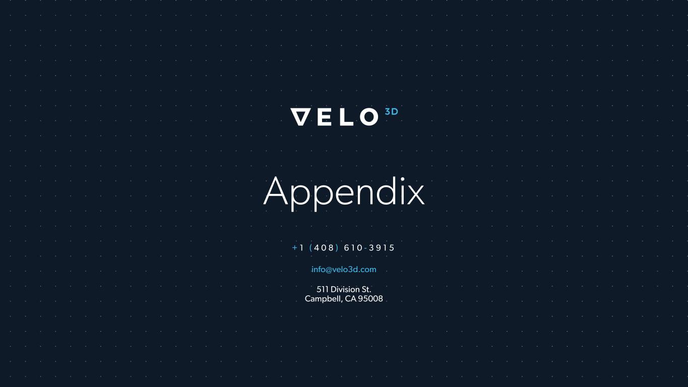 + 1 ( 4 0 8 ) 6 1 0 - 3 9 1 5 info@velo3d.com 511 Division St. Campbell, CA 95008 Appendix