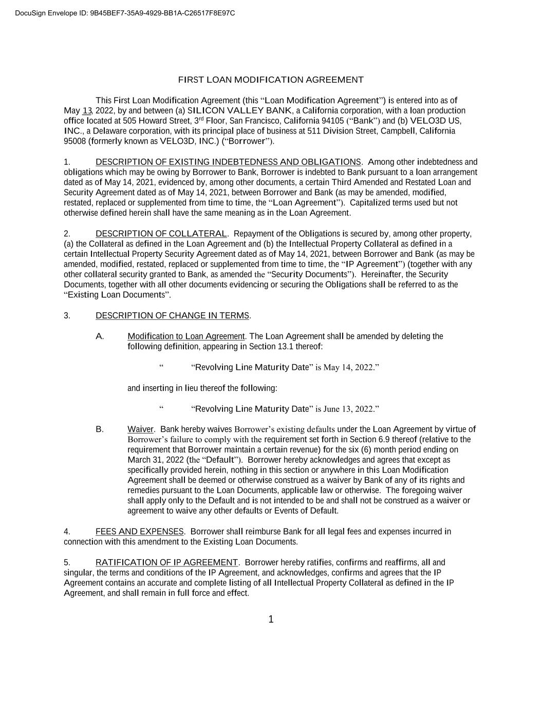 1 FIRST LOAN MODIFICATION AGREEMENT This First Loan Modification Agreement (this “Loan Modification Agreement”) is entered into as of May __, 2022, by and between (a) SILICON VALLEY BANK, a California corporation, with a loan production office located at 505 Howard Street, 3rd Floor, San Francisco, California 94105 (“Bank”) and (b) VELO3D US, INC., a Delaware corporation, with its principal place of business at 511 Division Street, Campbell, California 95008 (formerly known as VELO3D, INC.) (“Borrower”). 1. DESCRIPTION OF EXISTING INDEBTEDNESS AND OBLIGATIONS. Among other indebtedness and obligations which may be owing by Borrower to Bank, Borrower is indebted to Bank pursuant to a loan arrangement dated as of May 14, 2021, evidenced by, among other documents, a certain Third Amended and Restated Loan and Security Agreement dated as of May 14, 2021, between Borrower and Bank (as may be amended, modified, restated, replaced or supplemented from time to time, the “Loan Agreement”). Capitalized terms used but not otherwise defined herein shall have the same meaning as in the Loan Agreement. 2. DESCRIPTION OF COLLATERAL. Repayment of the Obligations is secured by, among other property, (a) the Collateral as defined in the Loan Agreement and (b) the Intellectual Property Collateral as defined in a certain Intellectual Property Security Agreement dated as of May 14, 2021, between Borrower and Bank (as may be amended, modified, restated, replaced or supplemented from time to time, the “IP Agreement”) (together with any other collateral security granted to Bank, as amended the “Security Documents”). Hereinafter, the Security Documents, together with all other documents evidencing or securing the Obligations shall be referred to as the “Existing Loan Documents”. 3. DESCRIPTION OF CHANGE IN TERMS. A. Modification to Loan Agreement. The Loan Agreement shall be amended by deleting the following definition, appearing in Section 13.1 thereof: “ “Revolving Line Maturity Date” is May 14, 2022.” and inserting in lieu thereof the following: “ “Revolving Line Maturity Date” is June 13, 2022.” B. Waiver. Bank hereby waives Borrower’s existing defaults under the Loan Agreement by virtue of Borrower’s failure to comply with the requirement set forth in Section 6.9 thereof (relative to the requirement that Borrower maintain a certain revenue) for the six (6) month period ending on March 31, 2022 (the “Default”). Borrower hereby acknowledges and agrees that except as specifically provided herein, nothing in this section or anywhere in this Loan Modification Agreement shall be deemed or otherwise construed as a waiver by Bank of any of its rights and remedies pursuant to the Loan Documents, applicable law or otherwise. The foregoing waiver shall apply only to the Default and is not intended to be and shall not be construed as a waiver or agreement to waive any other defaults or Events of Default. 4. FEES AND EXPENSES. Borrower shall reimburse Bank for all legal fees and expenses incurred in connection with this amendment to the Existing Loan Documents. 5. RATIFICATION OF IP AGREEMENT. Borrower hereby ratifies, confirms and reaffirms, all and singular, the terms and conditions of the IP Agreement, and acknowledges, confirms and agrees that the IP Agreement contains an accurate and complete listing of all Intellectual Property Collateral as defined in the IP Agreement, and shall remain in full force and effect. DocuSign Envelope ID: 9B45BEF7-35A9-4929-BB1A-C26517F8E97C 13