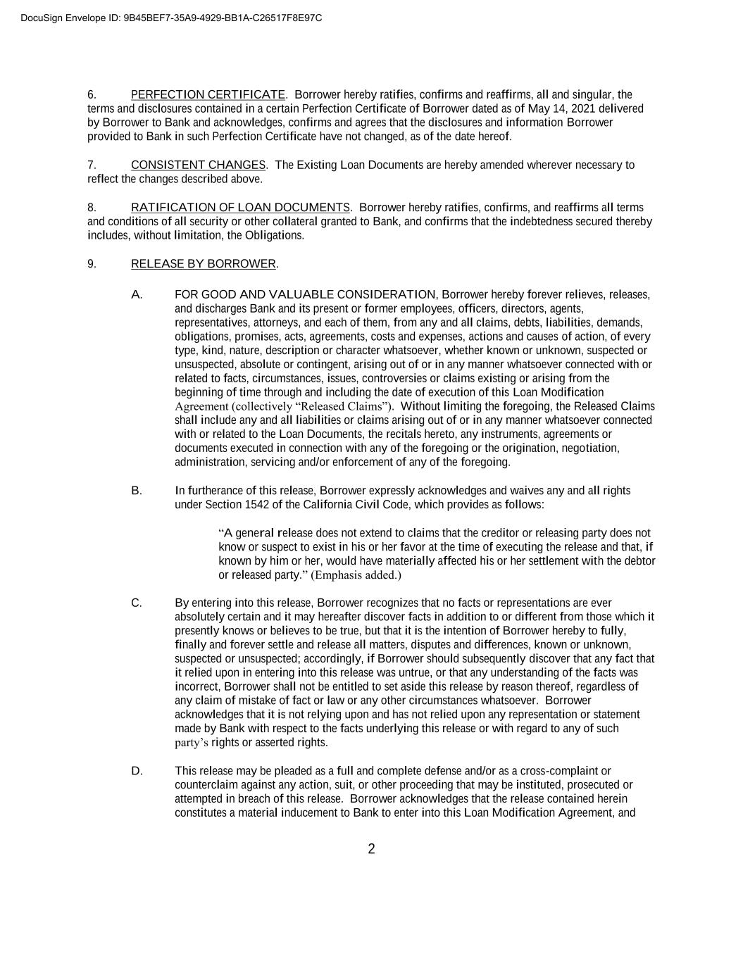 2 6. PERFECTION CERTIFICATE. Borrower hereby ratifies, confirms and reaffirms, all and singular, the terms and disclosures contained in a certain Perfection Certificate of Borrower dated as of May 14, 2021 delivered by Borrower to Bank and acknowledges, confirms and agrees that the disclosures and information Borrower provided to Bank in such Perfection Certificate have not changed, as of the date hereof. 7. CONSISTENT CHANGES. The Existing Loan Documents are hereby amended wherever necessary to reflect the changes described above. 8. RATIFICATION OF LOAN DOCUMENTS. Borrower hereby ratifies, confirms, and reaffirms all terms and conditions of all security or other collateral granted to Bank, and confirms that the indebtedness secured thereby includes, without limitation, the Obligations. 9. RELEASE BY BORROWER. A. FOR GOOD AND VALUABLE CONSIDERATION, Borrower hereby forever relieves, releases, and discharges Bank and its present or former employees, officers, directors, agents, representatives, attorneys, and each of them, from any and all claims, debts, liabilities, demands, obligations, promises, acts, agreements, costs and expenses, actions and causes of action, of every type, kind, nature, description or character whatsoever, whether known or unknown, suspected or unsuspected, absolute or contingent, arising out of or in any manner whatsoever connected with or related to facts, circumstances, issues, controversies or claims existing or arising from the beginning of time through and including the date of execution of this Loan Modification Agreement (collectively “Released Claims”). Without limiting the foregoing, the Released Claims shall include any and all liabilities or claims arising out of or in any manner whatsoever connected with or related to the Loan Documents, the recitals hereto, any instruments, agreements or documents executed in connection with any of the foregoing or the origination, negotiation, administration, servicing and/or enforcement of any of the foregoing. B. In furtherance of this release, Borrower expressly acknowledges and waives any and all rights under Section 1542 of the California Civil Code, which provides as follows: “A general release does not extend to claims that the creditor or releasing party does not know or suspect to exist in his or her favor at the time of executing the release and that, if known by him or her, would have materially affected his or her settlement with the debtor or released party.” (Emphasis added.) C. By entering into this release, Borrower recognizes that no facts or representations are ever absolutely certain and it may hereafter discover facts in addition to or different from those which it presently knows or believes to be true, but that it is the intention of Borrower hereby to fully, finally and forever settle and release all matters, disputes and differences, known or unknown, suspected or unsuspected; accordingly, if Borrower should subsequently discover that any fact that it relied upon in entering into this release was untrue, or that any understanding of the facts was incorrect, Borrower shall not be entitled to set aside this release by reason thereof, regardless of any claim of mistake of fact or law or any other circumstances whatsoever. Borrower acknowledges that it is not relying upon and has not relied upon any representation or statement made by Bank with respect to the facts underlying this release or with regard to any of such party’s rights or asserted rights. D. This release may be pleaded as a full and complete defense and/or as a cross-complaint or counterclaim against any action, suit, or other proceeding that may be instituted, prosecuted or attempted in breach of this release. Borrower acknowledges that the release contained herein constitutes a material inducement to Bank to enter into this Loan Modification Agreement, and DocuSign Envelope ID: 9B45BEF7-35A9-4929-BB1A-C26517F8E97C