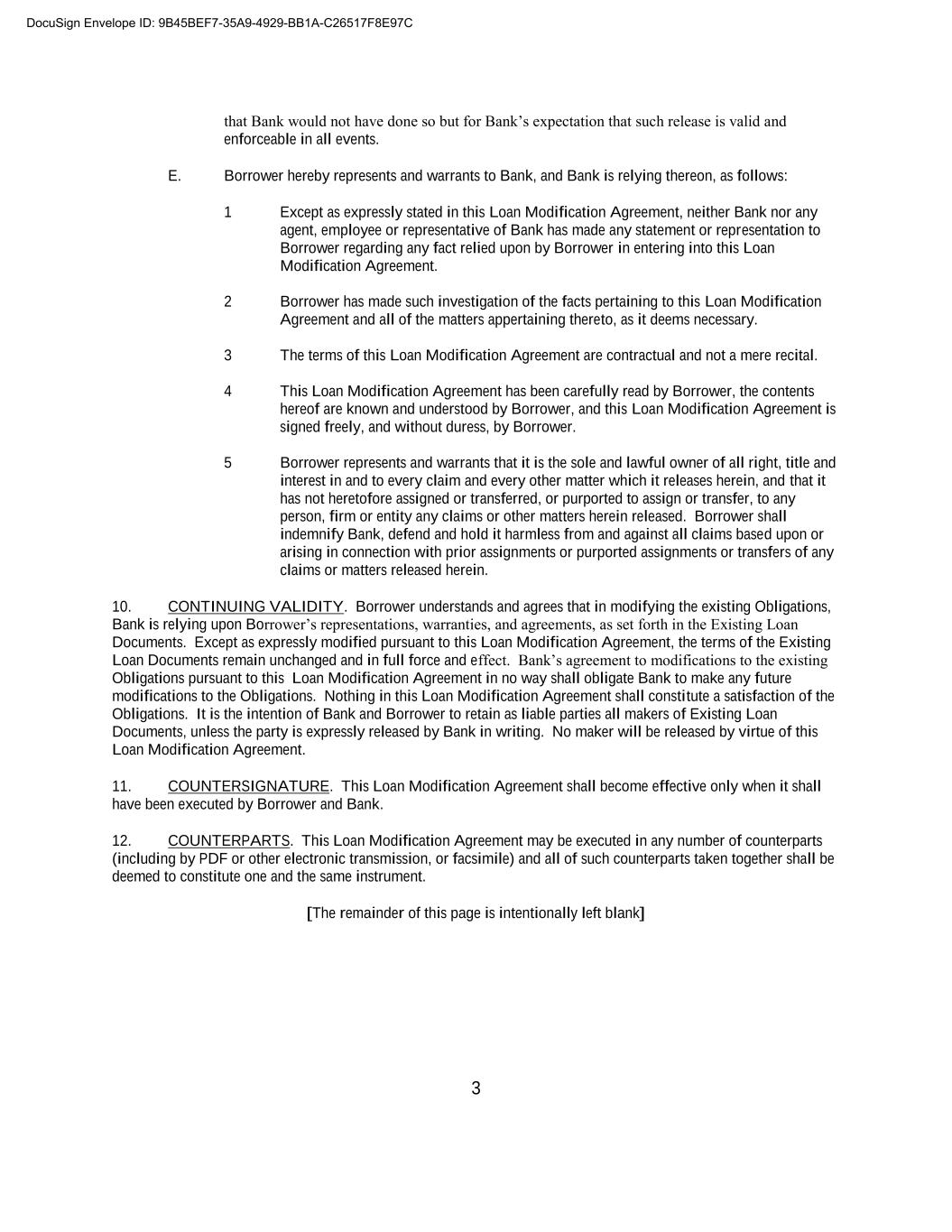 3 that Bank would not have done so but for Bank’s expectation that such release is valid and enforceable in all events. E. Borrower hereby represents and warrants to Bank, and Bank is relying thereon, as follows: 1 Except as expressly stated in this Loan Modification Agreement, neither Bank nor any agent, employee or representative of Bank has made any statement or representation to Borrower regarding any fact relied upon by Borrower in entering into this Loan Modification Agreement. 2 Borrower has made such investigation of the facts pertaining to this Loan Modification Agreement and all of the matters appertaining thereto, as it deems necessary. 3 The terms of this Loan Modification Agreement are contractual and not a mere recital. 4 This Loan Modification Agreement has been carefully read by Borrower, the contents hereof are known and understood by Borrower, and this Loan Modification Agreement is signed freely, and without duress, by Borrower. 5 Borrower represents and warrants that it is the sole and lawful owner of all right, title and interest in and to every claim and every other matter which it releases herein, and that it has not heretofore assigned or transferred, or purported to assign or transfer, to any person, firm or entity any claims or other matters herein released. Borrower shall indemnify Bank, defend and hold it harmless from and against all claims based upon or arising in connection with prior assignments or purported assignments or transfers of any claims or matters released herein. 10. CONTINUING VALIDITY. Borrower understands and agrees that in modifying the existing Obligations, Bank is relying upon Borrower’s representations, warranties, and agreements, as set forth in the Existing Loan Documents. Except as expressly modified pursuant to this Loan Modification Agreement, the terms of the Existing Loan Documents remain unchanged and in full force and effect. Bank’s agreement to modifications to the existing Obligations pursuant to this Loan Modification Agreement in no way shall obligate Bank to make any future modifications to the Obligations. Nothing in this Loan Modification Agreement shall constitute a satisfaction of the Obligations. It is the intention of Bank and Borrower to retain as liable parties all makers of Existing Loan Documents, unless the party is expressly released by Bank in writing. No maker will be released by virtue of this Loan Modification Agreement. 11. COUNTERSIGNATURE. This Loan Modification Agreement shall become effective only when it shall have been executed by Borrower and Bank. 12. COUNTERPARTS. This Loan Modification Agreement may be executed in any number of counterparts (including by PDF or other electronic transmission, or facsimile) and all of such counterparts taken together shall be deemed to constitute one and the same instrument. [The remainder of this page is intentionally left blank] DocuSign Envelope ID: 9B45BEF7-35A9-4929-BB1A-C26517F8E97C