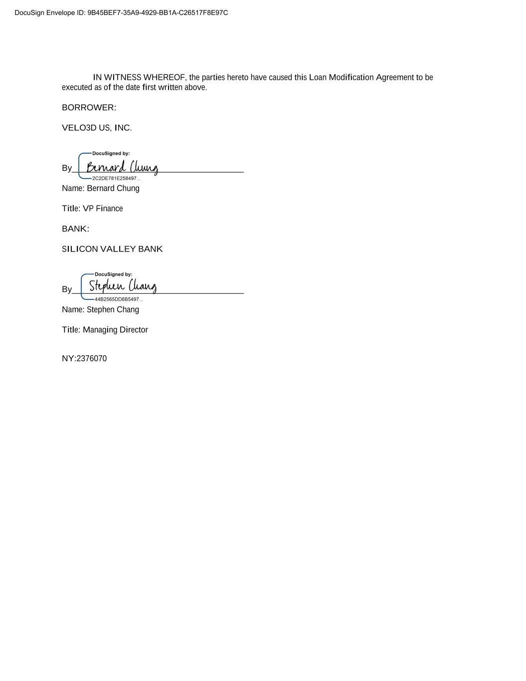 IN WITNESS WHEREOF, the parties hereto have caused this Loan Modification Agreement to be executed as of the date first written above. BORROWER: VELO3D US, INC. By________________________________________ Name: Bernard Chung Title: VP Finance BANK: SILICON VALLEY BANK By________________________________________ Name: Stephen Chang Title: Managing Director NY:2376070 DocuSign Envelope ID: 9B45BEF7-35A9-4929-BB1A-C26517F8E97C