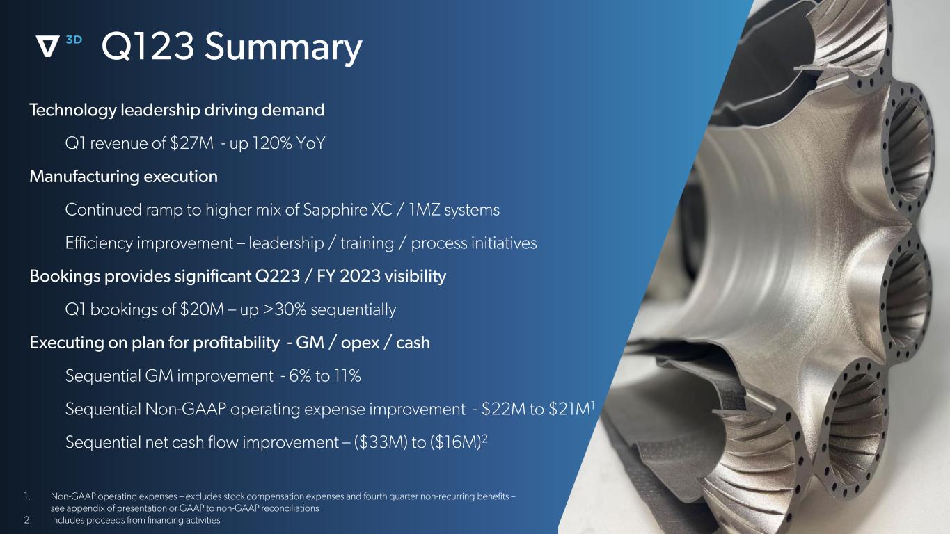 3 Q123 Summary Technology leadership driving demand Q1 revenue of $27M - up 120% YoY Manufacturing execution Continued ramp to higher mix of Sapphire XC / 1MZ systems Efficiency improvement – leadership / training / process initiatives Bookings provides significant Q223 / FY 2023 visibility Q1 bookings of $20M – up >30% sequentially Executing on plan for profitability - GM / opex / cash Sequential GM improvement - 6% to 11% Sequential Non-GAAP operating expense improvement - $22M to $21M1 Sequential net cash flow improvement – ($33M) to ($16M)2 1. Non-GAAP operating expenses – excludes stock compensation expenses and fourth quarter non-recurring benefits – see appendix of presentation or GAAP to non-GAAP reconciliations 2. Includes proceeds from financing activities