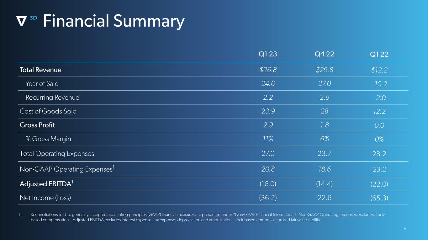 8 Financial Summary 1. Reconciliations to U.S. generally accepted accounting principles (GAAP) financial measures are presented under “Non-GAAP Financial Information.” Non-GAAP Operating Expenses excludes stock- based compensation . Adjusted EBITDA excludes interest expense, tax expense, depreciation and amortization, stock-based compensation and fair value liabilities. Q1 23 Q4 22 Q1 22 Total Revenue $26.8 $29.8 $12.2 Year of Sale 24.6 27.0 10.2 Recurring Revenue 2.2 2.8 2.0 Cost of Goods Sold 23.9 28 12.2 Gross Profit 2.9 1.8 0.0 % Gross Margin 11% 6% 0% Total Operating Expenses 27.0 23.7 28.2 Non-GAAP Operating Expenses1 20.8 18.6 23.2 Adjusted EBITDA1 (16.0) (14.4) (22.0) Net Income (Loss) (36.2) 22.6 (65.3)