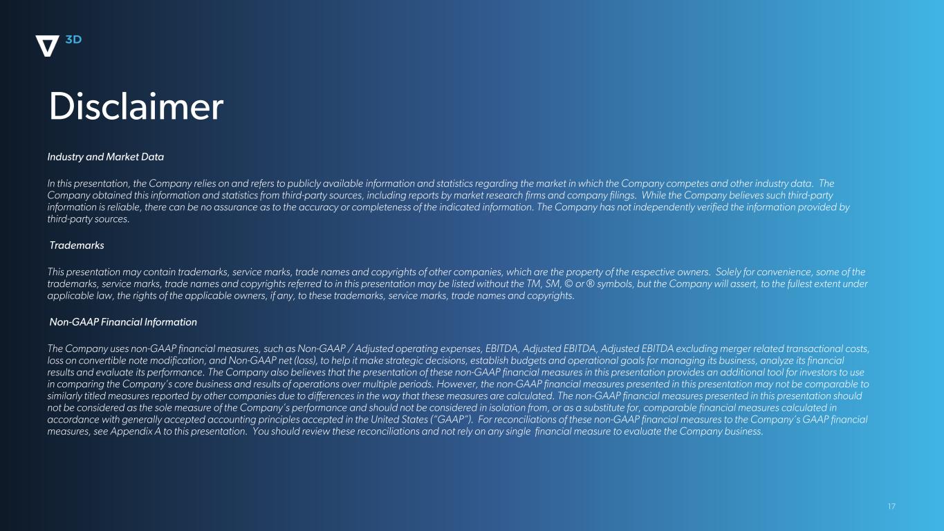 17 Disclaimer Industry and Market Data In this presentation, the Company relies on and refers to publicly available information and statistics regarding the market in which the Company competes and other industry data. The Company obtained this information and statistics from third-party sources, including reports by market research firms and company filings. While the Company believes such third-party information is reliable, there can be no assurance as to the accuracy or completeness of the indicated information. The Company has not independently verified the information provided by third-party sources. Trademarks This presentation may contain trademarks, service marks, trade names and copyrights of other companies, which are the property of the respective owners. Solely for convenience, some of the trademarks, service marks, trade names and copyrights referred to in this presentation may be listed without the TM, SM, © or ® symbols, but the Company will assert, to the fullest extent under applicable law, the rights of the applicable owners, if any, to these trademarks, service marks, trade names and copyrights. Non-GAAP Financial Information The Company uses non-GAAP financial measures, such as Non-GAAP / Adjusted operating expenses, EBITDA, Adjusted EBITDA, Adjusted EBITDA excluding merger related transactional costs, loss on convertible note modification, and Non-GAAP net (loss), to help it make strategic decisions, establish budgets and operational goals for managing its business, analyze its financial results and evaluate its performance. The Company also believes that the presentation of these non-GAAP financial measures in this presentation provides an additional tool for investors to use in comparing the Company’s core business and results of operations over multiple periods. However, the non-GAAP financial measures presented in this presentation may not be comparable to similarly titled measures reported by other companies due to differences in the way that these measures are calculated. The non-GAAP financial measures presented in this presentation should not be considered as the sole measure of the Company’s performance and should not be considered in isolation from, or as a substitute for, comparable financial measures calculated in accordance with generally accepted accounting principles accepted in the United States (“GAAP”). For reconciliations of these non-GAAP financial measures to the Company’s GAAP financial measures, see Appendix A to this presentation. You should review these reconciliations and not rely on any single financial measure to evaluate the Company business.