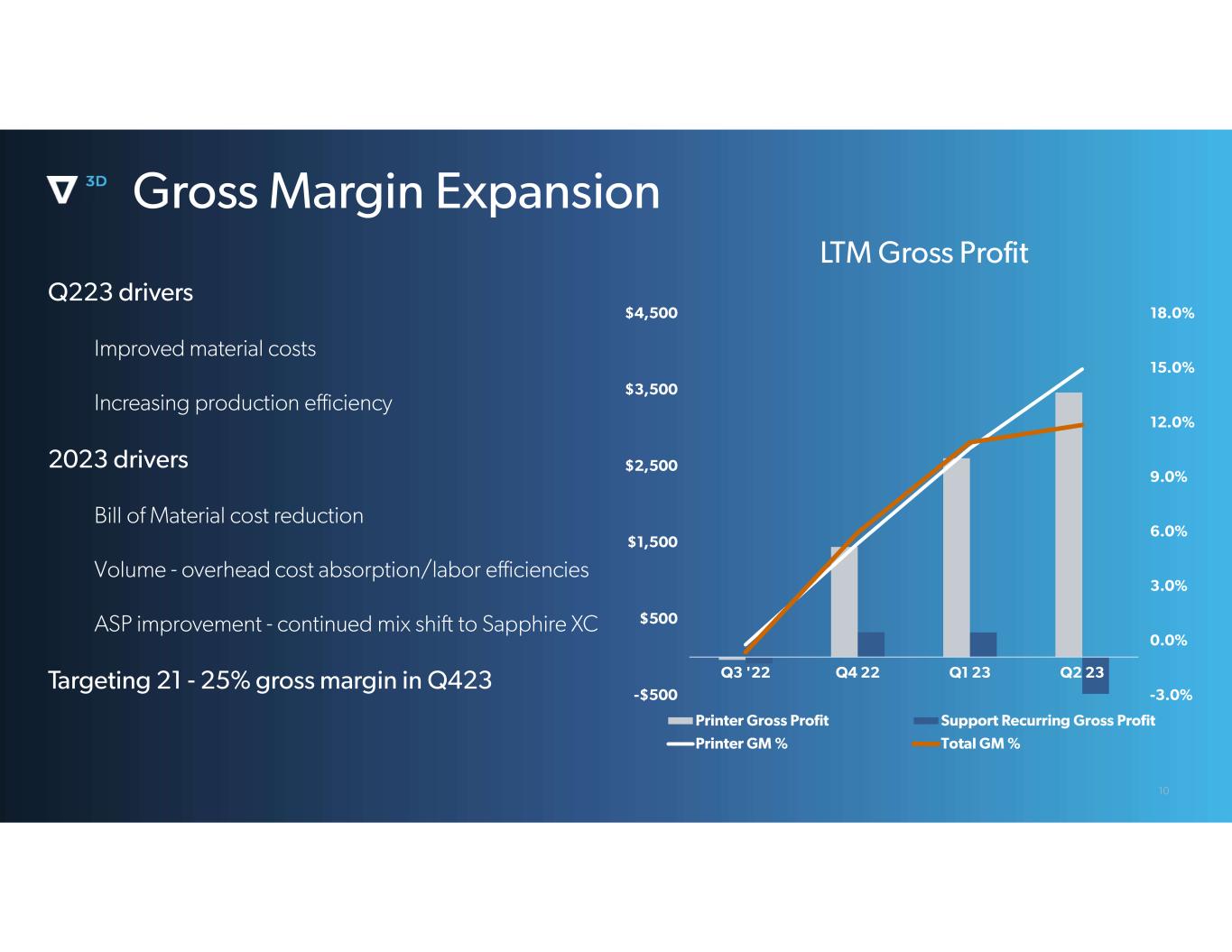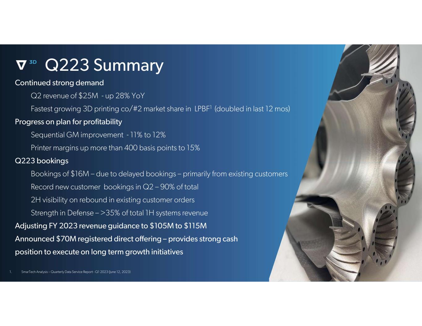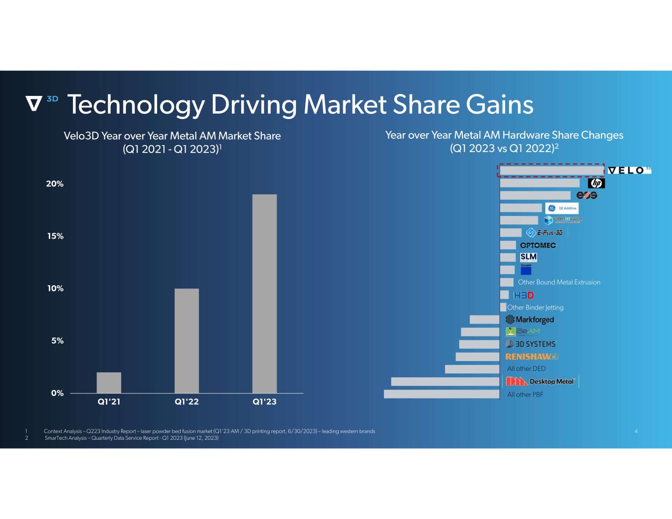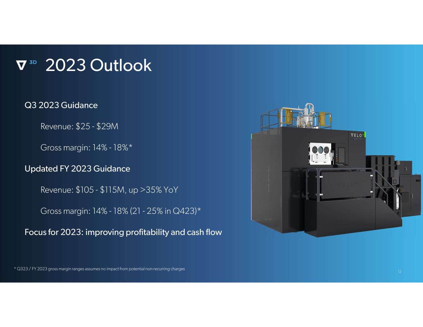 Velo3D, Inc. NON-GAAP Net Income (Loss) Reconciliation (Unaudited) Three months ended Six months ended Three months ended June 30, 2023 June 30, 2022 June 30, 2023 June 30, 2022 March 31, 2023 March 31, 2022 (In thousands, except for percentages) % of Rev % of Rev % of Rev % of Rev % of Rev % of Rev Revenue $ 25,134 100.0 % $ 19,644 100.0 % $ 51,948 100.0 % $ 31,862 100.0 % $ 26,814 100.0 % $ 12,218 100.0 % Gross Profit 2,980 11.9 % 1,232 6.3 % 5,905 11.4 % 1,247 3.9 % 2,925 10.9 % 15 0.1 % Net Income (Loss) $ (23,201) (92.3)% $ 127,950 651.3 % $ (59,399) (114.3)% $ 62,608 196.5 % $ (36,198) (135.0)% $ (65,341) (534.8)% Stock-based compensation 6,534 26.0 % 4,976 25.3 % 12,770 24.6 % 9,933 31.2 % 6,236 23.3 % 4,957 40.6 % (Gain) Loss on fair value of warrants (828) (3.3)% (23,665) (120.5)% 1,725 3.3 % (17,651) (55.4)% 2,553 9.5 % 6,014 49.2 % (Gain) Loss on fair value of contingent earnout liabilities (1,843) (7.3)% (130,227) (662.9)% 7,810 15.0 % (98,995) (310.7)% 9,653 36.0 % 31,232 255.6 % Non-GAAP Net Loss $ (19,338) (76.9)% $ (20,966) (106.7)% $ (37,094) (71.4)% $ (44,105) (138.4)% $ (17,756) (66.2)% $ (23,138) (189.4)%