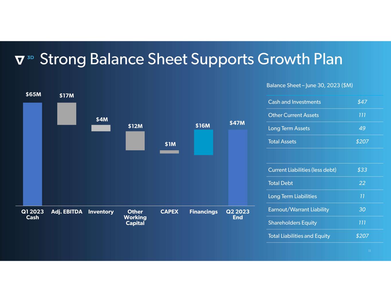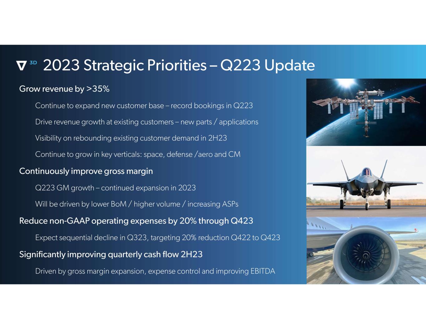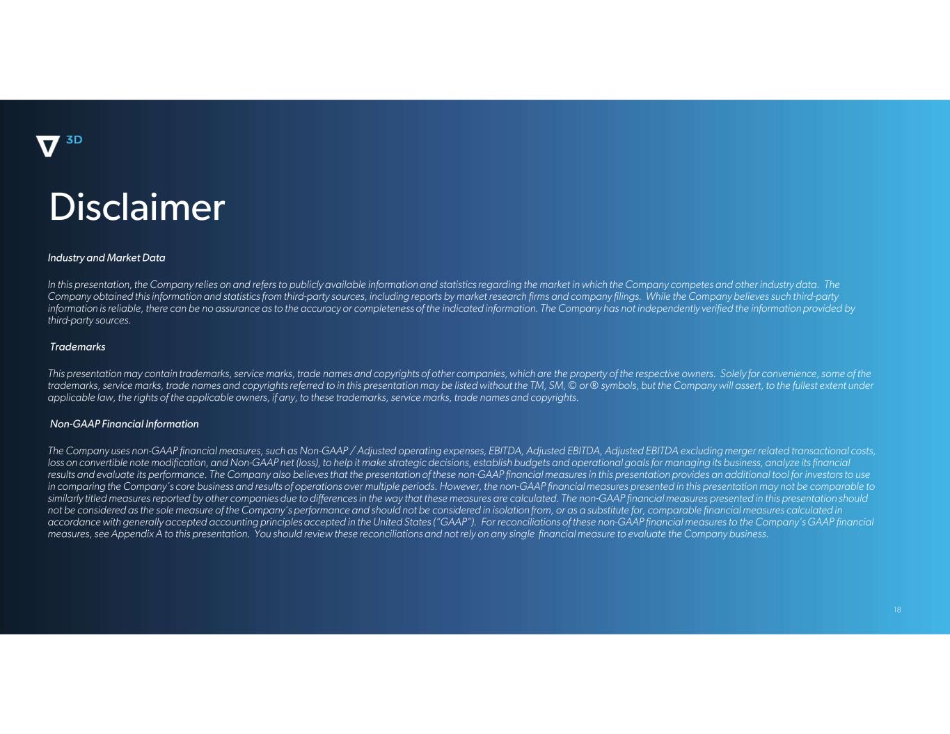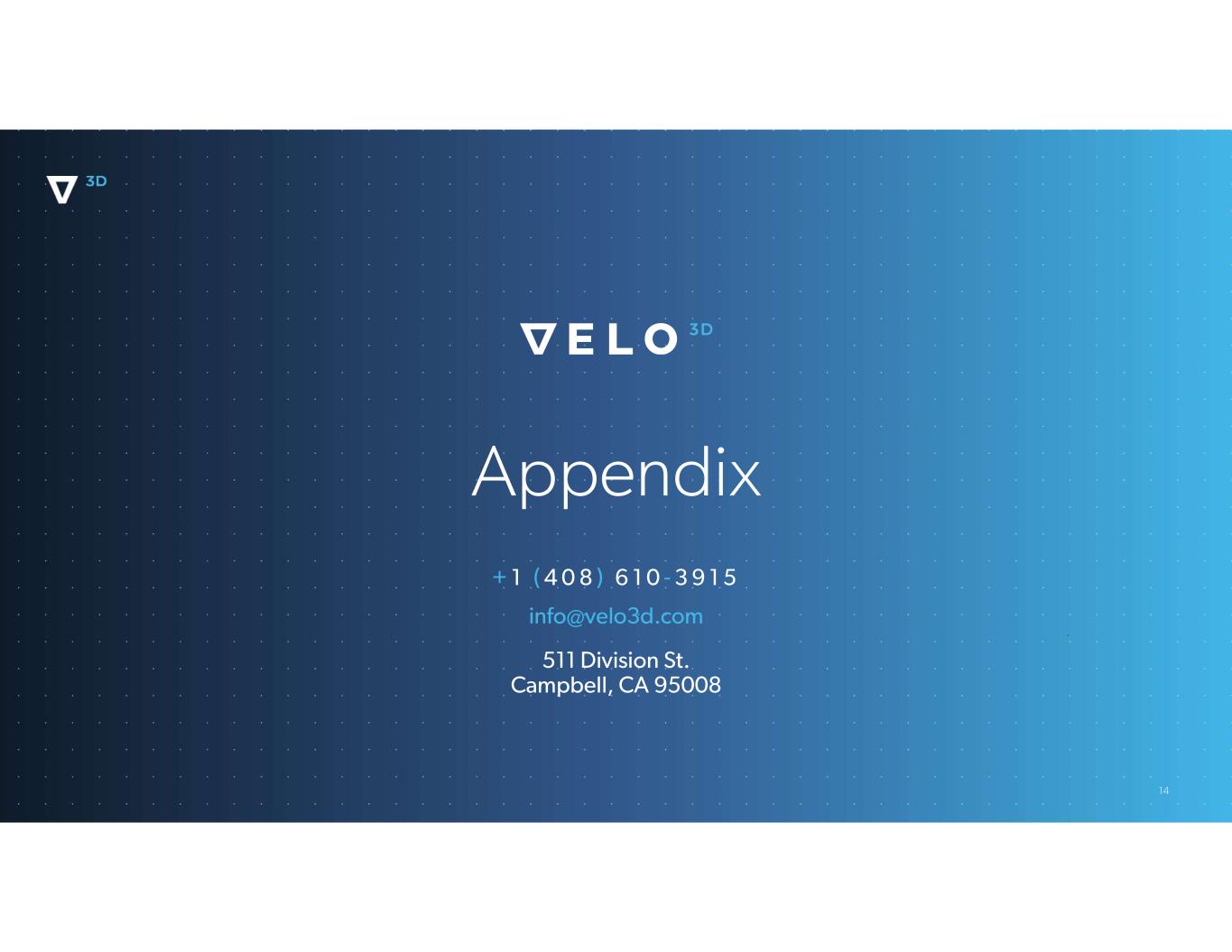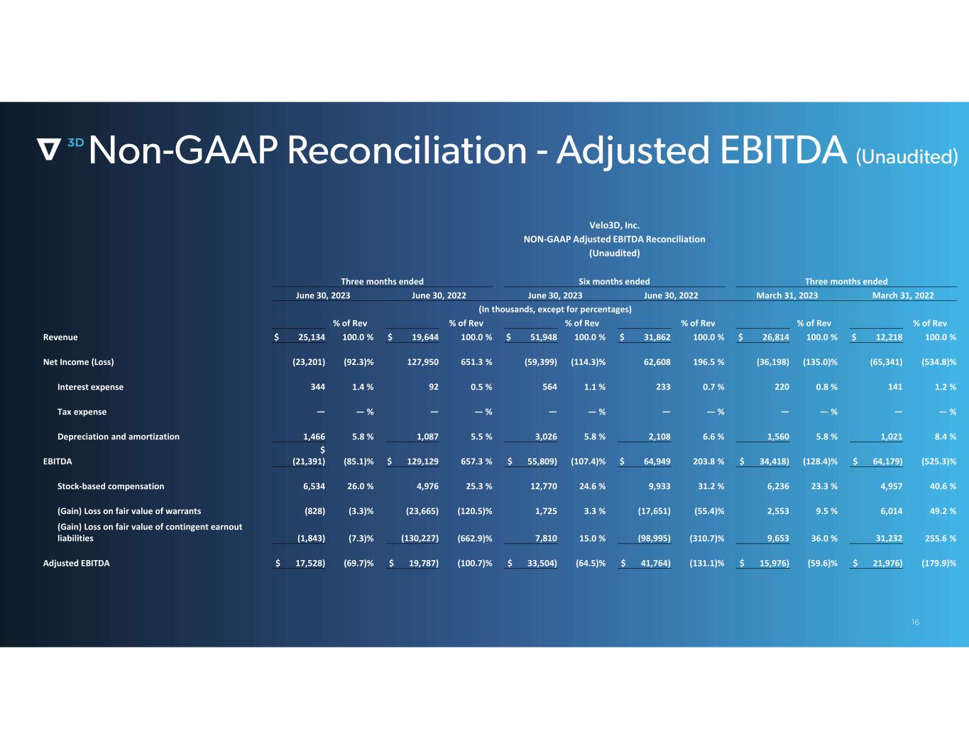 Velo3D, Inc. NON-GAAP Adjusted EBITDA Reconciliation (Unaudited) Three months ended Six months ended Three months ended June 30, 2023 June 30, 2022 June 30, 2023 June 30, 2022 March 31, 2023 March 31, 2022 (In thousands, except for percentages) % of Rev % of Rev % of Rev % of Rev % of Rev % of Rev Revenue $ 25,134 100.0 % $ 19,644 100.0 % $ 51,948 100.0 % $ 31,862 100.0 % $ 26,814 100.0 % $ 12,218 100.0 % Net Income (Loss) (23,201) (92.3)% 127,950 651.3 % (59,399) (114.3)% 62,608 196.5 % (36,198) (135.0)% (65,341) (534.8)% Interest expense 344 1.4 % 92 0.5 % 564 1.1 % 233 0.7 % 220 0.8 % 141 1.2 % Tax expense — — % — — % — — % — — % — — % — — % Depreciation and amortization 1,466 5.8 % 1,087 5.5 % 3,026 5.8 % 2,108 6.6 % 1,560 5.8 % 1,021 8.4 % EBITDA $ (21,391) (85.1)% $ 129,129 657.3 % $ 55,809) (107.4)% $ 64,949 203.8 % $ 34,418) (128.4)% $ 64,179) (525.3)% Stock-based compensation 6,534 26.0 % 4,976 25.3 % 12,770 24.6 % 9,933 31.2 % 6,236 23.3 % 4,957 40.6 % (Gain) Loss on fair value of warrants (828) (3.3)% (23,665) (120.5)% 1,725 3.3 % (17,651) (55.4)% 2,553 9.5 % 6,014 49.2 % (Gain) Loss on fair value of contingent earnout liabilities (1,843) (7.3)% (130,227) (662.9)% 7,810 15.0 % (98,995) (310.7)% 9,653 36.0 % 31,232 255.6 % Adjusted EBITDA $ 17,528) (69.7)% $ 19,787) (100.7)% $ 33,504) (64.5)% $ 41,764) (131.1)% $ 15,976) (59.6)% $ 21,976) (179.9)%