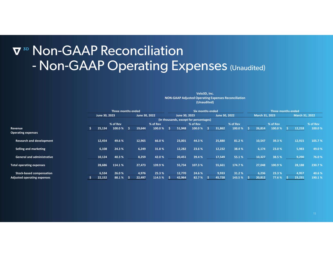 Velo3D, Inc. NON-GAAP Adjusted Operating Expenses Reconciliation (Unaudited) Three months ended Six months ended Three months ended June 30, 2023 June 30, 2022 June 30, 2023 June 30, 2022 March 31, 2023 March 31, 2022 (In thousands, except for percentages) % of Rev % of Rev % of Rev % of Rev % of Rev % of Rev Revenue $ 25,134 100.0 % $ 19,644 100.0 % $ 51,948 100.0 % $ 31,862 100.0 % $ 26,814 100.0 % $ 12,218 100.0 % Operating expenses Research and development 12,454 49.6 % 12,965 66.0 % 23,001 44.3 % 25,880 81.2 % 10,547 39.3 % 12,915 105.7 % Selling and marketing 6,108 24.3 % 6,249 31.8 % 12,282 23.6 % 12,232 38.4 % 6,174 23.0 % 5,983 49.0 % General and administrative 10,124 40.3 % 8,259 42.0 % 20,451 39.4 % 17,549 55.1 % 10,327 38.5 % 9,290 76.0 % Total operating expenses 28,686 114.1 % 27,473 139.9 % 55,734 107.3 % 55,661 174.7 % 27,048 100.9 % 28,188 230.7 % Stock-based compensation 6,534 26.0 % 4,976 25.3 % 12,770 24.6 % 9,933 31.2 % 6,236 23.3 % 4,957 40.6 % Adjusted operating expenses $ 22,152 88.1 % $ 22,497 114.5 % $ 42,964 82.7 % $ 45,728 143.5 % $ 20,812 77.6 % $ 23,231 190.1 %