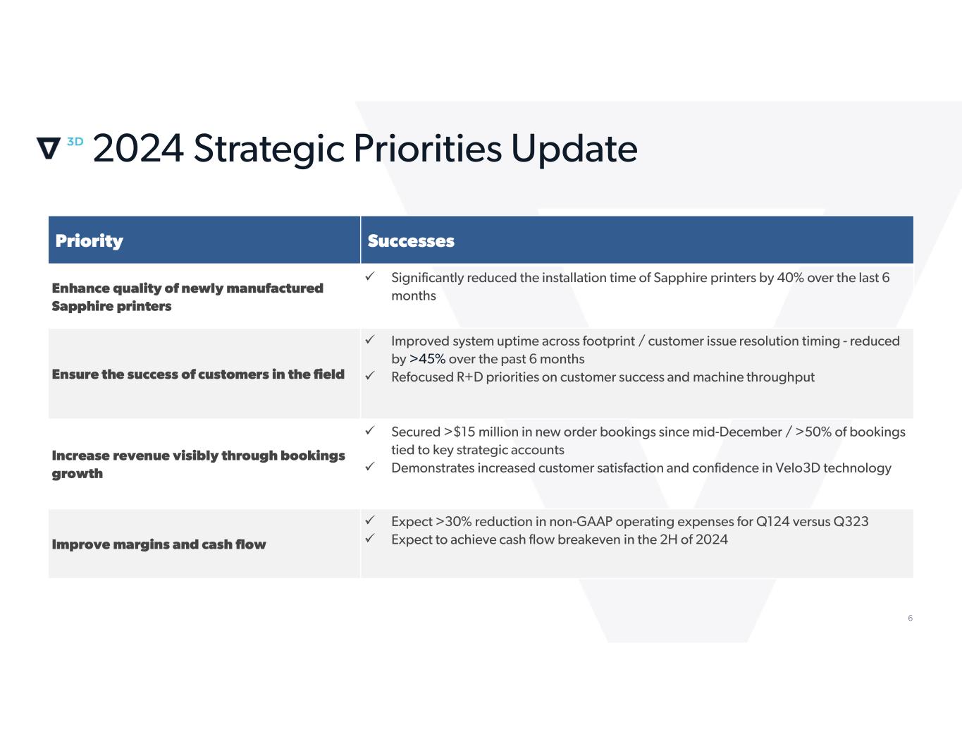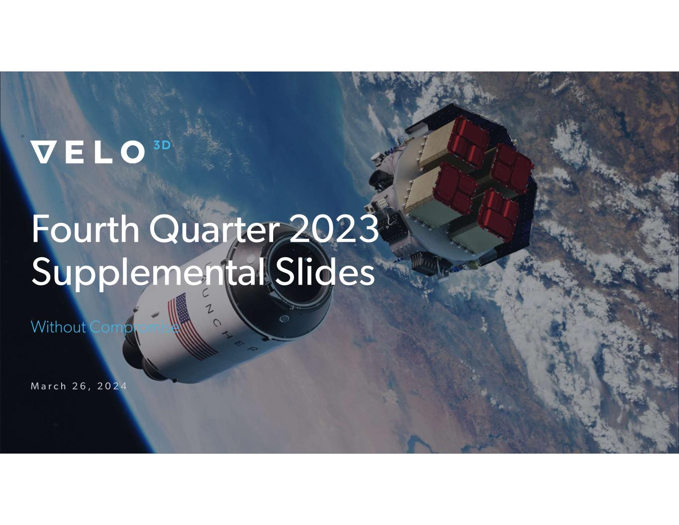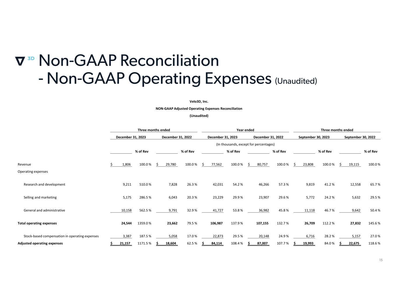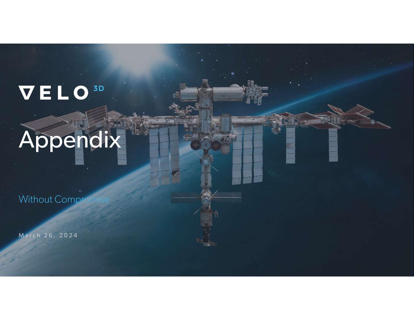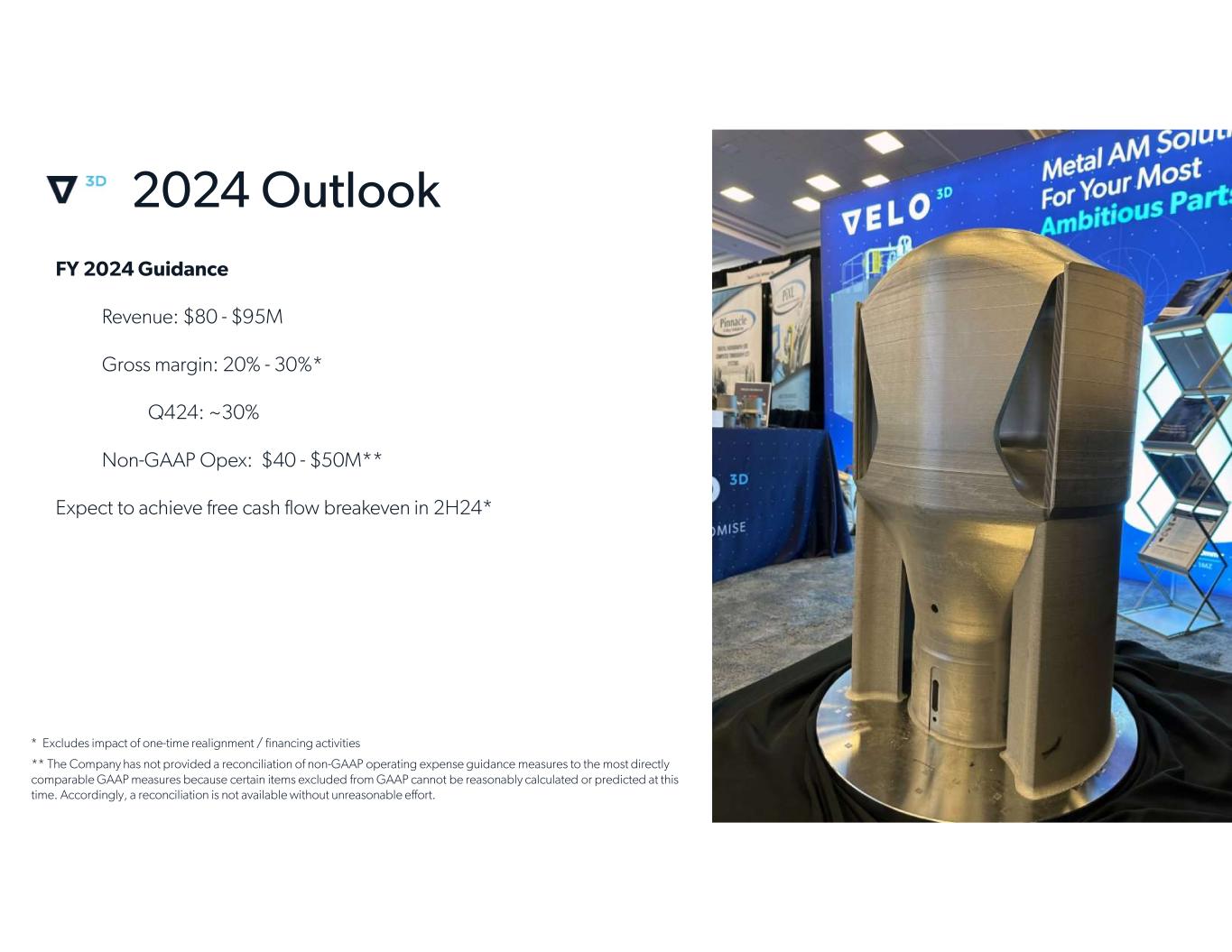 Velo3D, Inc. NON-GAAP Adjusted Operating Expenses Reconciliation (Unaudited) Three months endedYear endedThree months ended September 30, 2022September 30, 2023December 31, 2022December 31, 2023December 31, 2022December 31, 2023 (In thousands, except for percentages) % of Rev% of Rev% of Rev% of Rev% of Rev% of Rev 100.0 %$ 19,115 100.0 %$ 23,808 100.0 %$ 80,757 100.0 %$ 77,562 100.0 %$ 29,780 100.0 %$ 1,806 Revenue Operating expenses 65.7 %12,55841.2 %9,81957.3 %46,26654.2 %42,03126.3 %7,828510.0 %9,211Research and development 29.5 %5,63224.2 %5,77229.6 %23,90729.9 %23,22920.3 %6,043286.5 %5,175Selling and marketing 50.4 %9,64246.7 %11,11845.8 %36,98253.8 %41,72732.9 %9,791562.5 %10,158General and administrative 145.6 %27,832112.2 %26,709132.7 %107,155137.9 %106,98779.5 %23,6621359.0 %24,544Total operating expenses 27.0 %5,15728.2 %6,71624.9 %20,14829.5 %22,87317.0 %5,058187.5 %3,387Stock-based compensation in operating expenses 118.6 %$ 22,675 84.0 %$ 19,993 107.7 %$ 87,007 108.4 %$ 84,114 62.5 %$ 18,604 1171.5 %$ 21,157 Adjusted operating expenses