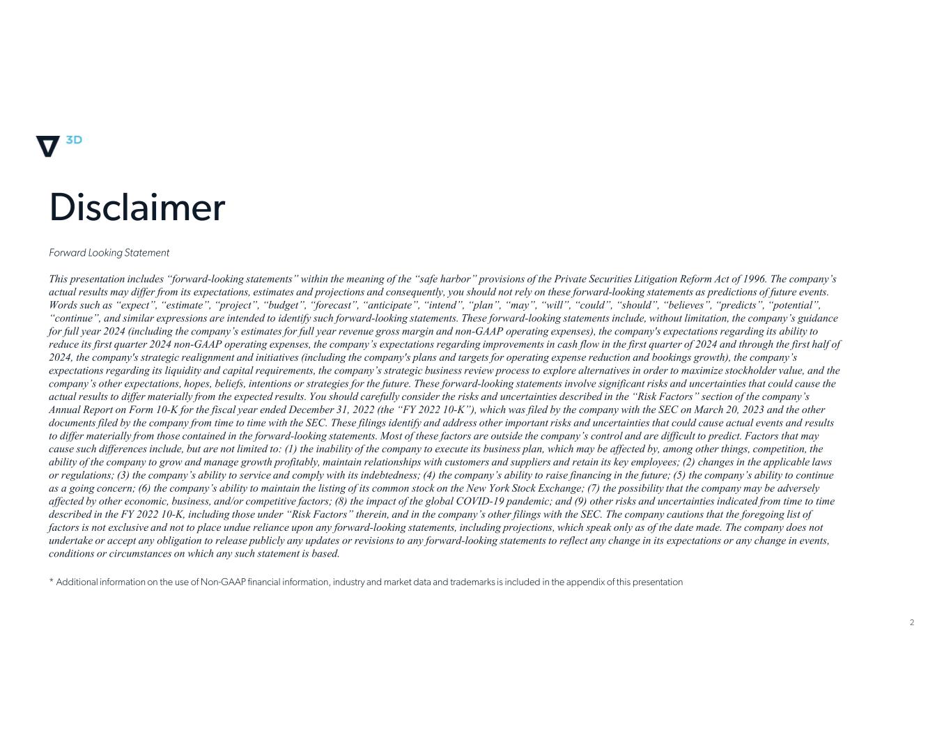This presentation includes “forward-looking statements” within the meaning of the “safe harbor” provisions of the Private Securities Litigation Reform Act of 1996. The company’s actual results may differ from its expectations, estimates and projections and consequently, you should not rely on these forward-looking statements as predictions of future events. Words such as “expect”, “estimate”, “project”, “budget”, “forecast”, “anticipate”, “intend”, “plan”, “may”, “will”, “could”, “should”, “believes”, “predicts”, “potential”, “continue”, and similar expressions are intended to identify such forward-looking statements. These forward-looking statements include, without limitation, the company’s guidance for full year 2024 (including the company’s estimates for full year revenue gross margin and non-GAAP operating expenses), the company's expectations regarding its ability to reduce its first quarter 2024 non-GAAP operating expenses, the company’s expectations regarding improvements in cash flow in the first quarter of 2024 and through the first half of 2024, the company's strategic realignment and initiatives (including the company's plans and targets for operating expense reduction and bookings growth), the company’s expectations regarding its liquidity and capital requirements, the company’s strategic business review process to explore alternatives in order to maximize stockholder value, and the company’s other expectations, hopes, beliefs, intentions or strategies for the future. These forward-looking statements involve significant risks and uncertainties that could cause the actual results to differ materially from the expected results. You should carefully consider the risks and uncertainties described in the “Risk Factors” section of the company’s Annual Report on Form 10-K for the fiscal year ended December 31, 2022 (the “FY 2022 10-K”), which was filed by the company with the SEC on March 20, 2023 and the other documents filed by the company from time to time with the SEC. These filings identify and address other important risks and uncertainties that could cause actual events and results to differ materially from those contained in the forward-looking statements. Most of these factors are outside the company’s control and are difficult to predict. Factors that may cause such differences include, but are not limited to: (1) the inability of the company to execute its business plan, which may be affected by, among other things, competition, the ability of the company to grow and manage growth profitably, maintain relationships with customers and suppliers and retain its key employees; (2) changes in the applicable laws or regulations; (3) the company’s ability to service and comply with its indebtedness; (4) the company’s ability to raise financing in the future; (5) the company’s ability to continue as a going concern; (6) the company’s ability to maintain the listing of its common stock on the New York Stock Exchange; (7) the possibility that the company may be adversely affected by other economic, business, and/or competitive factors; (8) the impact of the global COVID-19 pandemic; and (9) other risks and uncertainties indicated from time to time described in the FY 2022 10-K, including those under “Risk Factors” therein, and in the company’s other filings with the SEC. The company cautions that the foregoing list of factors is not exclusive and not to place undue reliance upon any forward-looking statements, including projections, which speak only as of the date made. The company does not undertake or accept any obligation to release publicly any updates or revisions to any forward-looking statements to reflect any change in its expectations or any change in events, conditions or circumstances on which any such statement is based.