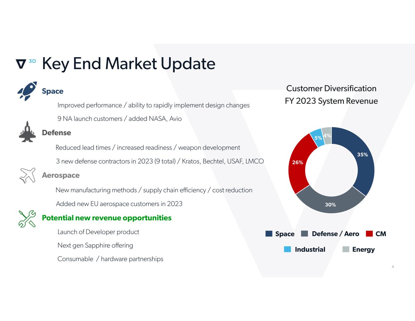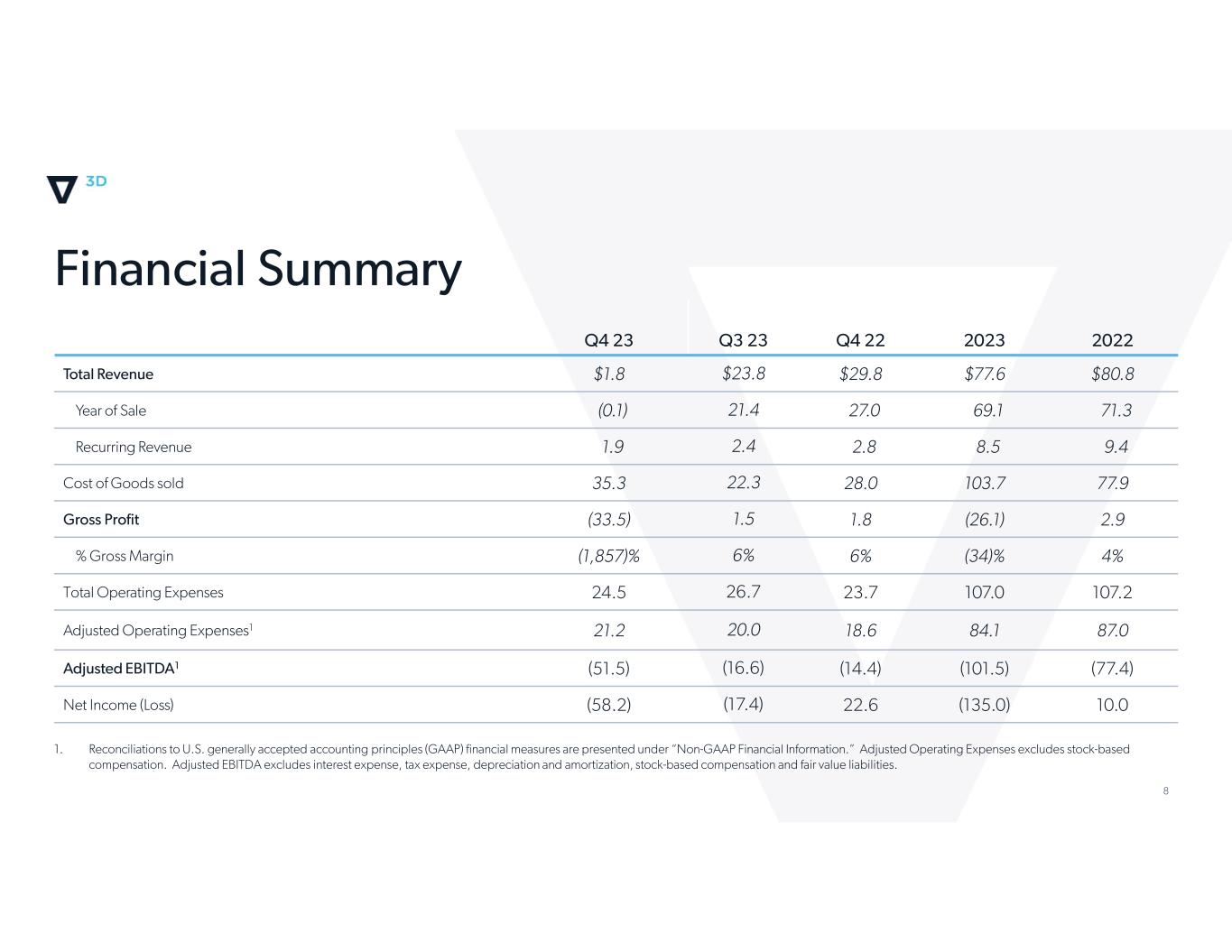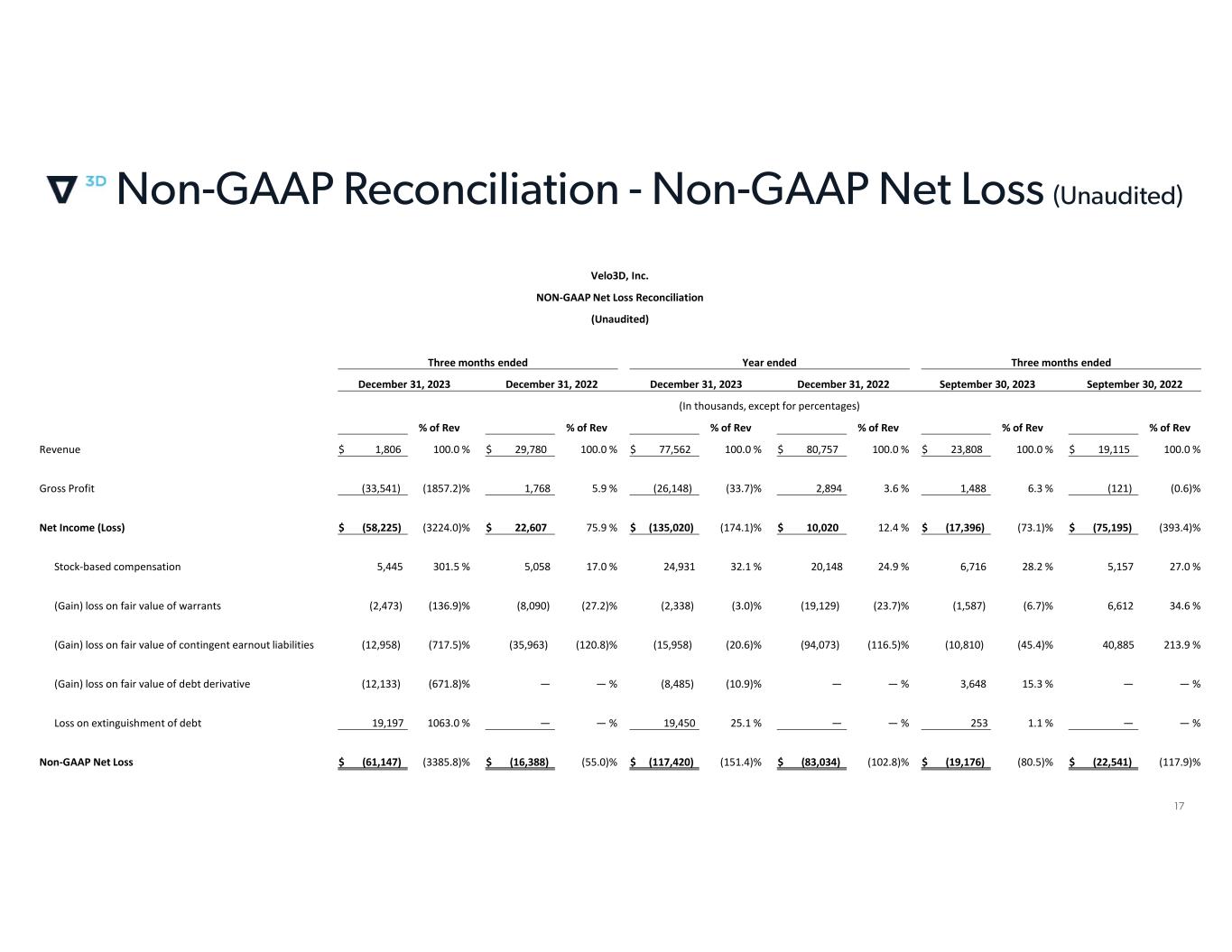 Velo3D, Inc. NON-GAAP Net Loss Reconciliation (Unaudited) Three months endedYear endedThree months ended September 30, 2022September 30, 2023December 31, 2022December 31, 2023December 31, 2022December 31, 2023 (In thousands, except for percentages) % of Rev% of Rev% of Rev% of Rev% of Rev% of Rev 100.0 %$ 19,115 100.0 %$ 23,808 100.0 %$ 80,757 100.0 %$ 77,562 100.0 %$ 29,780 100.0 %$ 1,806 Revenue (0.6)%(121)6.3 %1,4883.6 %2,894(33.7)%(26,148)5.9 %1,768(1857.2)%(33,541)Gross Profit (393.4)%$ (75,195)(73.1)%$ (17,396)12.4 %$ 10,020 (174.1)%$ (135,020)75.9 %$ 22,607 (3224.0)%$ (58,225)Net Income (Loss) 27.0 %5,15728.2 %6,71624.9 %20,14832.1 %24,93117.0 %5,058301.5 %5,445Stock-based compensation 34.6 %6,612(6.7)%(1,587)(23.7)%(19,129)(3.0)%(2,338)(27.2)%(8,090)(136.9)%(2,473)(Gain) loss on fair value of warrants 213.9 %40,885(45.4)%(10,810)(116.5)%(94,073)(20.6)%(15,958)(120.8)%(35,963)(717.5)%(12,958)(Gain) loss on fair value of contingent earnout liabilities — %—15.3 %3,648— %—(10.9)%(8,485)— %—(671.8)%(12,133)(Gain) loss on fair value of debt derivative — %—1.1 %253— %—25.1 %19,450— %—1063.0 %19,197Loss on extinguishment of debt (117.9)%$ (22,541)(80.5)%$ (19,176)(102.8)%$ (83,034)(151.4)%$ (117,420)(55.0)%$ (16,388)(3385.8)%$ (61,147)Non-GAAP Net Loss