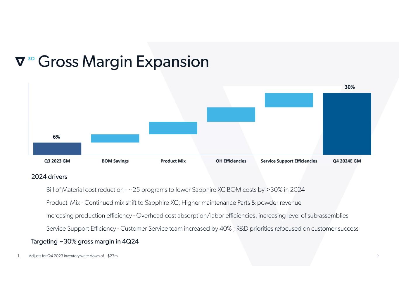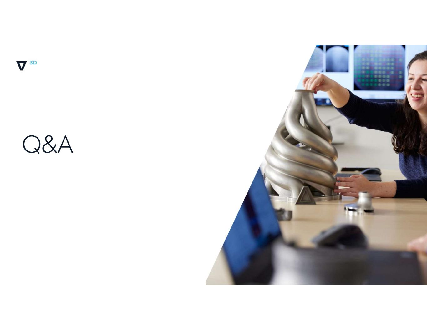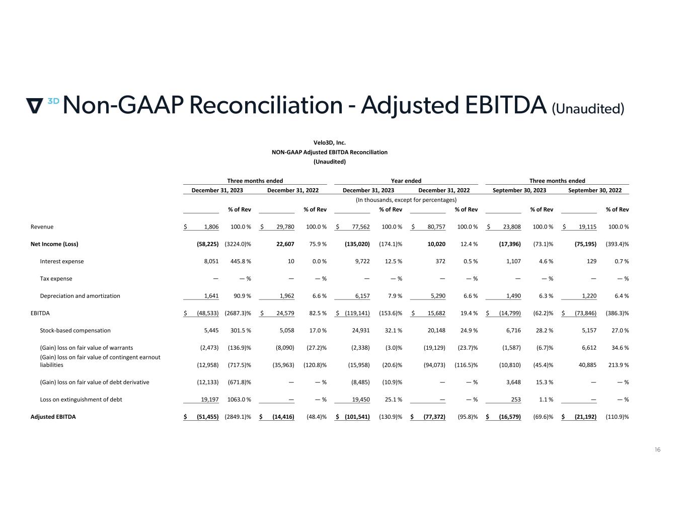 Velo3D, Inc. NON-GAAP Adjusted EBITDA Reconciliation (Unaudited) Three months endedYear endedThree months ended September 30, 2022September 30, 2023December 31, 2022December 31, 2023December 31, 2022December 31, 2023 (In thousands, except for percentages) % of Rev% of Rev% of Rev% of Rev% of Rev% of Rev 100.0 %$ 19,115 100.0 %$ 23,808 100.0 %$ 80,757 100.0 %$ 77,562 100.0 %$ 29,780 100.0 %$ 1,806 Revenue (393.4)%(75,195)(73.1)%(17,396)12.4 %10,020(174.1)%(135,020)75.9 %22,607(3224.0)%(58,225)Net Income (Loss) 0.7 %1294.6 %1,1070.5 %37212.5 %9,7220.0 %10445.8 %8,051Interest expense — %—— %—— %—— %—— %—— %—Tax expense 6.4 %1,2206.3 %1,4906.6 %5,2907.9 %6,1576.6 %1,96290.9 %1,641Depreciation and amortization (386.3)%$ (73,846)(62.2)%$ (14,799)19.4 %$ 15,682 (153.6)%$ (119,141)82.5 %$ 24,579 (2687.3)%$ (48,533)EBITDA 27.0 %5,15728.2 %6,71624.9 %20,14832.1 %24,93117.0 %5,058301.5 %5,445Stock-based compensation 34.6 %6,612(6.7)%(1,587)(23.7)%(19,129)(3.0)%(2,338)(27.2)%(8,090)(136.9)%(2,473)(Gain) loss on fair value of warrants 213.9 %40,885(45.4)%(10,810)(116.5)%(94,073)(20.6)%(15,958)(120.8)%(35,963)(717.5)%(12,958) (Gain) loss on fair value of contingent earnout liabilities — %—15.3 %3,648— %—(10.9)%(8,485)— %—(671.8)%(12,133)(Gain) loss on fair value of debt derivative — %—1.1 %253— %—25.1 %19,450— %—1063.0 %19,197Loss on extinguishment of debt (110.9)%$ (21,192)(69.6)%$ (16,579)(95.8)%$ (77,372)(130.9)%$ (101,541)(48.4)%$ (14,416)(2849.1)%$ (51,455)Adjusted EBITDA