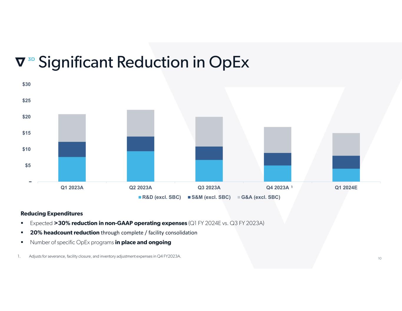 through complete / facility consolidation $5 $10 $15 $20 $25 $30 Q1 2023A Q2 2023A Q3 2023A Q4 2023A Q1 2024E R&D (excl. SBC) S&M (excl. SBC) G&A (excl. SBC)
