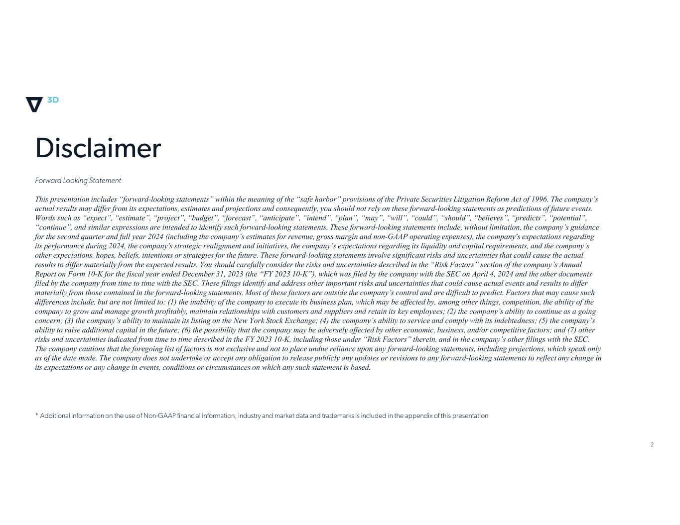 This presentation includes “forward-looking statements” within the meaning of the “safe harbor” provisions of the Private Securities Litigation Reform Act of 1996. The company’s actual results may differ from its expectations, estimates and projections and consequently, you should not rely on these forward-looking statements as predictions of future events. Words such as “expect”, “estimate”, “project”, “budget”, “forecast”, “anticipate”, “intend”, “plan”, “may”, “will”, “could”, “should”, “believes”, “predicts”, “potential”, “continue”, and similar expressions are intended to identify such forward-looking statements. These forward-looking statements include, without limitation, the company’s guidance for the second quarter and full year 2024 (including the company’s estimates for revenue, gross margin and non-GAAP operating expenses), the company's expectations regarding its performance during 2024, the company's strategic realignment and initiatives, the company’s expectations regarding its liquidity and capital requirements, and the company’s other expectations, hopes, beliefs, intentions or strategies for the future. These forward-looking statements involve significant risks and uncertainties that could cause the actual results to differ materially from the expected results. You should carefully consider the risks and uncertainties described in the “Risk Factors” section of the company’s Annual Report on Form 10-K for the fiscal year ended December 31, 2023 (the “FY 2023 10-K”), which was filed by the company with the SEC on April 4, 2024 and the other documents filed by the company from time to time with the SEC. These filings identify and address other important risks and uncertainties that could cause actual events and results to differ materially from those contained in the forward-looking statements. Most of these factors are outside the company’s control and are difficult to predict. Factors that may cause such differences include, but are not limited to: (1) the inability of the company to execute its business plan, which may be affected by, among other things, competition, the ability of the company to grow and manage growth profitably, maintain relationships with customers and suppliers and retain its key employees; (2) the company’s ability to continue as a going concern; (3) the company’s ability to maintain its listing on the New York Stock Exchange; (4) the company’s ability to service and comply with its indebtedness; (5) the company’s ability to raise additional capital in the future; (6) the possibility that the company may be adversely affected by other economic, business, and/or competitive factors; and (7) other risks and uncertainties indicated from time to time described in the FY 2023 10-K, including those under “Risk Factors” therein, and in the company’s other filings with the SEC. The company cautions that the foregoing list of factors is not exclusive and not to place undue reliance upon any forward-looking statements, including projections, which speak only as of the date made. The company does not undertake or accept any obligation to release publicly any updates or revisions to any forward-looking statements to reflect any change in its expectations or any change in events, conditions or circumstances on which any such statement is based.
