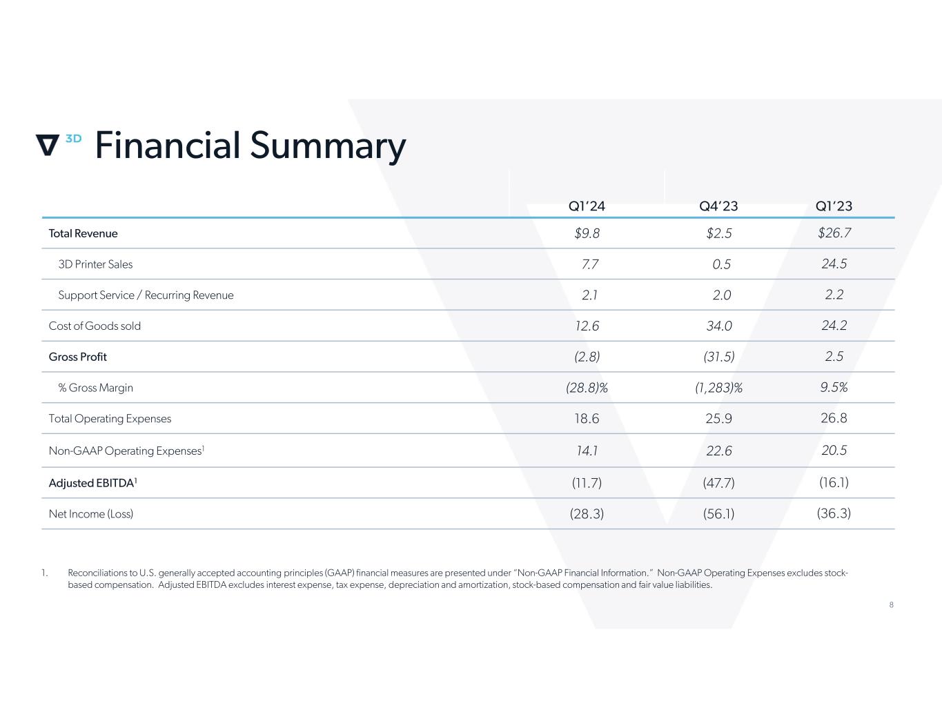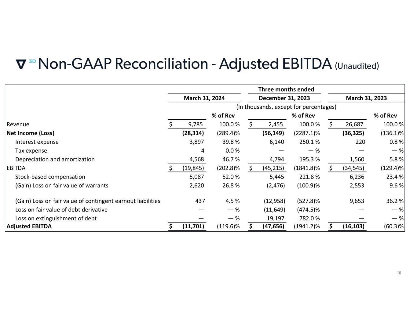 % of Rev % of Rev % of Rev Revenue $ 9,785 100.0 % $ 2,455 100.0 % $ 26,687 100.0 % Net Income (Loss) (28,314) (289.4)% (56,149) (2287.1)% (36,325) (136.1)% Interest expense 3,897 39.8 % 6,140 250.1 % 220 0.8 % Tax expense 4 0.0 % — — % — — % Depreciation and amortization 4,568 46.7 % 4,794 195.3 % 1,560 5.8 % EBITDA $ (19,845) (202.8)% $ (45,215) (1841.8)% $ (34,545) (129.4)% Stock-based compensation 5,087 52.0 % 5,445 221.8 % 6,236 23.4 % (Gain) Loss on fair value of warrants 2,620 26.8 % (2,476) (100.9)% 2,553 9.6 % (Gain) Loss on fair value of contingent earnout liabilities 437 4.5 % (12,958) (527.8)% 9,653 36.2 % Loss on fair value of debt derivative — — % (11,649) (474.5)% — — % Loss on extinguishment of debt — — % 19,197 782.0 % — — % Adjusted EBITDA $ (11,701) (119.6)% $ (47,656) (1941.2)% $ (16,103) (60.3)% (In thousands, except for percentages) Three months ended March 31, 2024 December 31, 2023 March 31, 2023