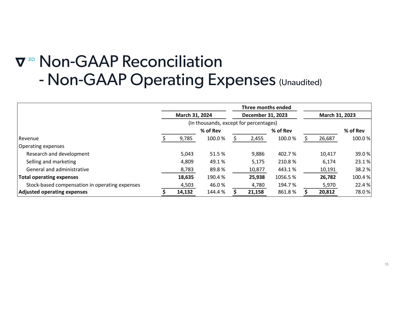 % of Rev % of Rev % of Rev Revenue $ 9,785 100.0 % $ 2,455 100.0 % $ 26,687 100.0 % Operating expenses Research and development 5,043 51.5 % 9,886 402.7 % 10,417 39.0 % Selling and marketing 4,809 49.1 % 5,175 210.8 % 6,174 23.1 % General and administrative 8,783 89.8 % 10,877 443.1 % 10,191 38.2 % Total operating expenses 18,635 190.4 % 25,938 1056.5 % 26,782 100.4 % Stock-based compensation in operating expenses 4,503 46.0 % 4,780 194.7 % 5,970 22.4 % Adjusted operating expenses $ 14,132 144.4 % $ 21,158 861.8 % $ 20,812 78.0 % (In thousands, except for percentages) Three months ended March 31, 2024 December 31, 2023 March 31, 2023