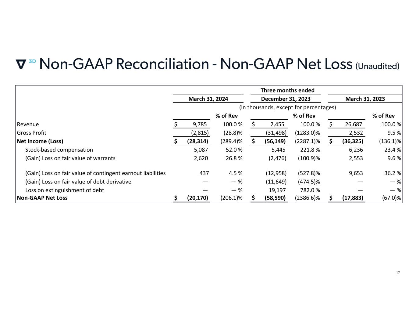 % of Rev % of Rev % of Rev Revenue $ 9,785 100.0 % $ 2,455 100.0 % $ 26,687 100.0 % Gross Profit (2,815) (28.8)% (31,498) (1283.0)% 2,532 9.5 % Net Income (Loss) $ (28,314) (289.4)% $ (56,149) (2287.1)% $ (36,325) (136.1)% Stock-based compensation 5,087 52.0 % 5,445 221.8 % 6,236 23.4 % (Gain) Loss on fair value of warrants 2,620 26.8 % (2,476) (100.9)% 2,553 9.6 % (Gain) Loss on fair value of contingent earnout liabilities 437 4.5 % (12,958) (527.8)% 9,653 36.2 % (Gain) Loss on fair value of debt derivative — — % (11,649) (474.5)% — — % Loss on extinguishment of debt — — % 19,197 782.0 % — — % Non-GAAP Net Loss $ (20,170) (206.1)% $ (58,590) (2386.6)% $ (17,883) (67.0)% (In thousands, except for percentages) Three months ended March 31, 2024 December 31, 2023 March 31, 2023